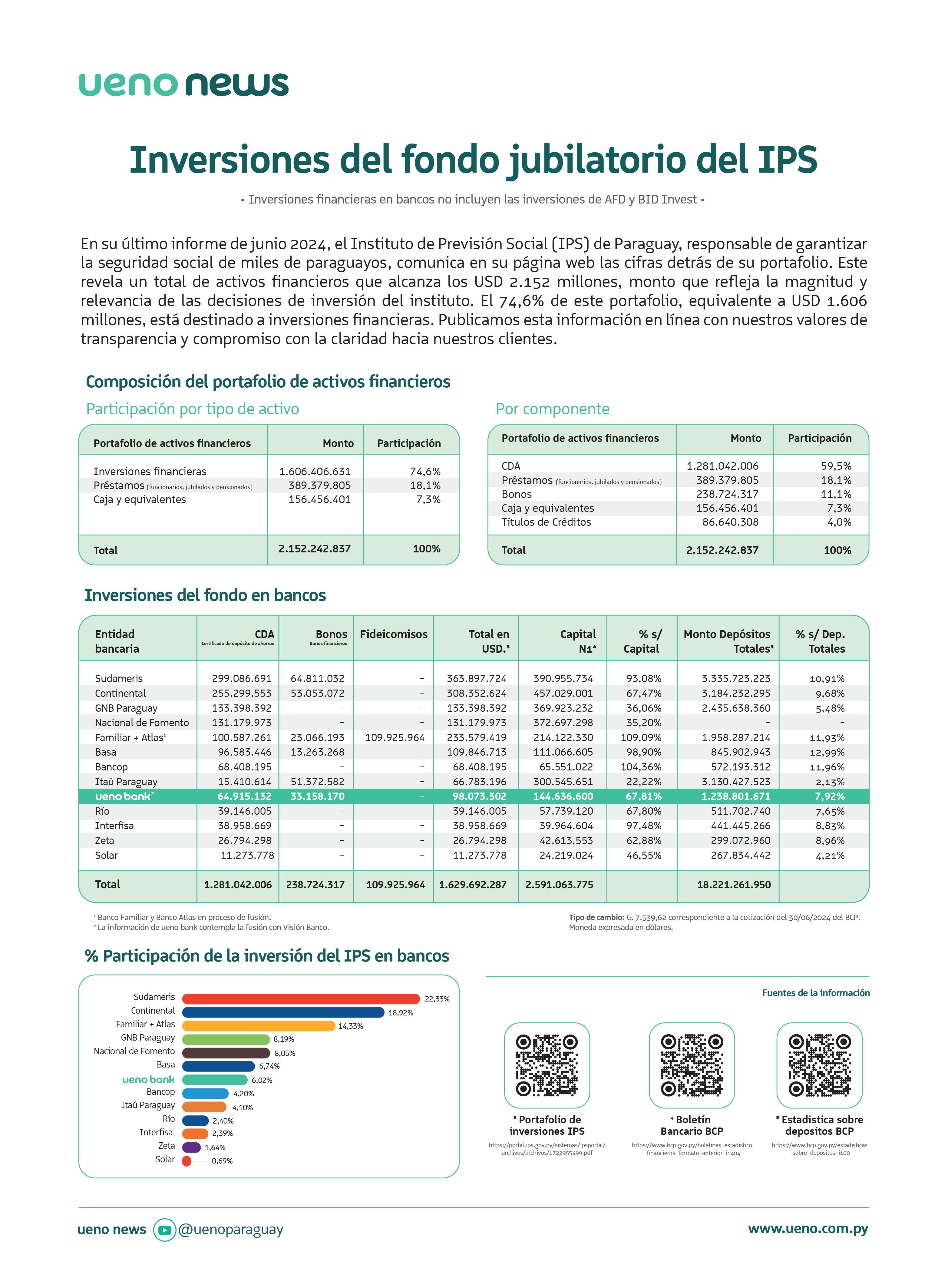 El Instituto de Previsión Social adquirió bonos por 250.000 millones de guaraníes emitidos por la entidad ueno. Se trata de una operación habitual que pretende generar rentabilidad a los fondos jubilatorios. El instrumento financiero está en el marco de la ley.