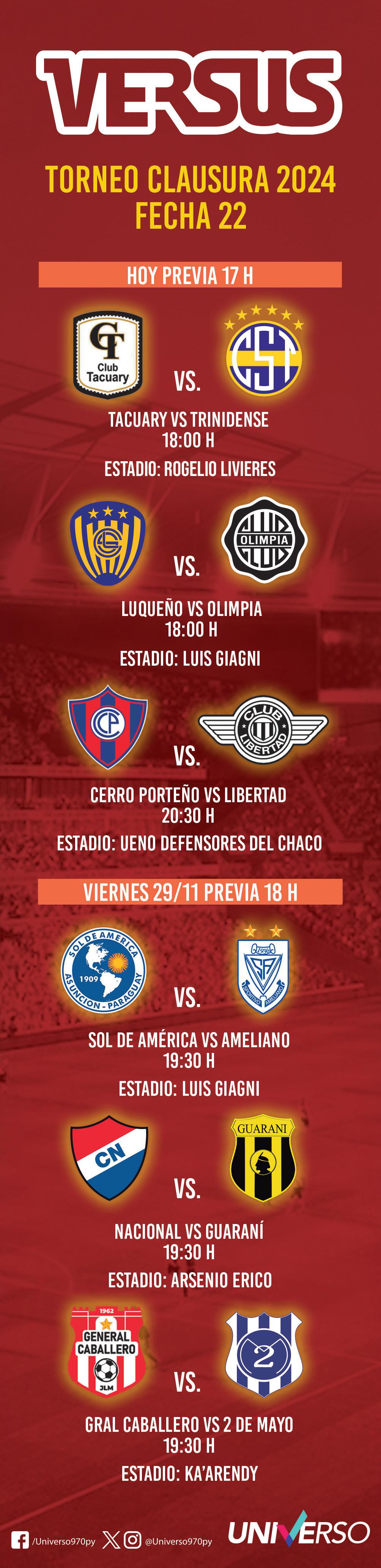 En tanto, el campeón Olimpia visitará a Sportivo Luqueño en Villa Elisa para cerrar su exitoso torneo, donde se consagró campeón con dos fechas de anticipación.