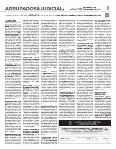 ASAMBLEA ORDINARIA. El Directorio de D&N INGENIERÍA S.A . convoca a asamblea ordinaria de accionistas para la fecha 13 de octubre de 2025, a las 15:00 horas en primera convocatoria, y para la fecha 24 de octubre de 2025, a las 16:00 horas, en segunda convocatoria, en el local social ubicado Coronel Bogado entre