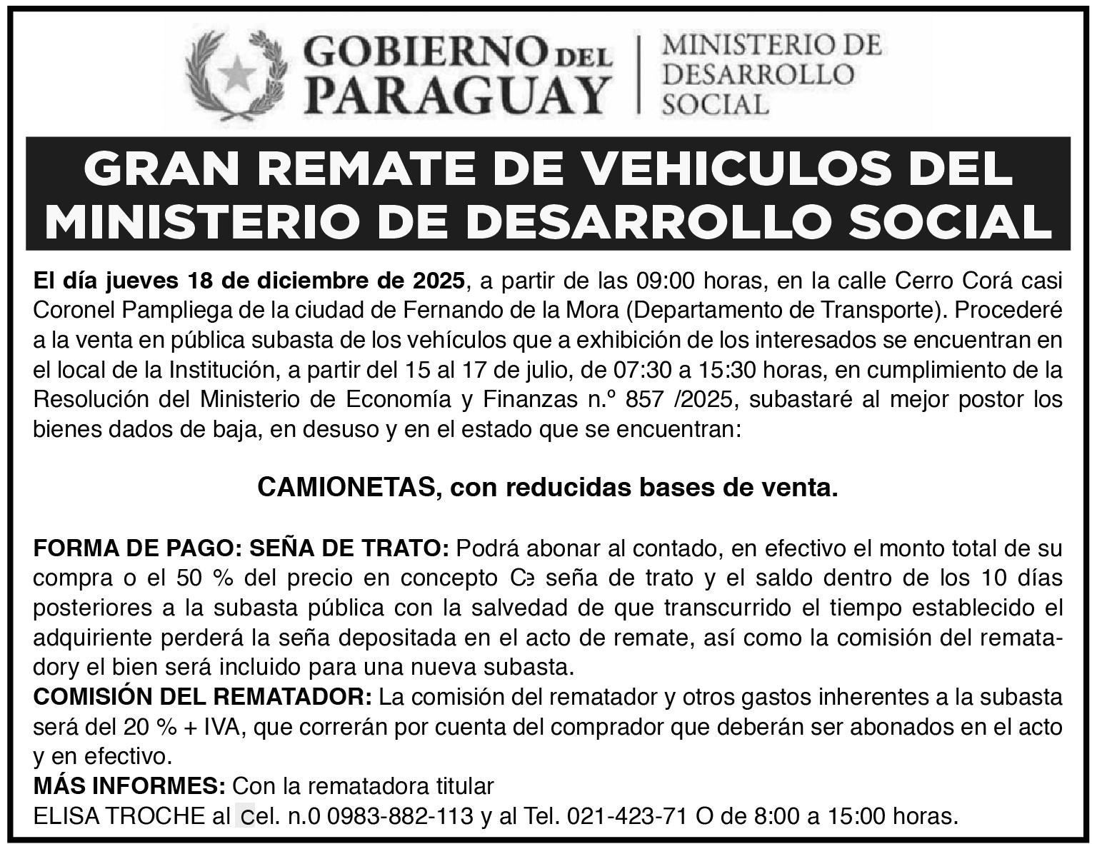 Comunico a interesados y en especial a linderos que el día lunes 29 de diciembre de 2025, a las 14:00 horas, iniciaré la mensura de una fracción de terreno presuntamente fiscal solicitada al I.N.D.E.R.T. por el Sr. MILTON DUARTE, a través del Expediente Administrativo No. 21210 / 2024 (y R. P. No. 3225/25), en el Paraje denominado Loma Barreto del Distrito de Mbocayaty del Guaira del Departamento de Guaira. Los linderos según antecedentes administrativos son: AL NORTE, linda con Calle; AL ESTE, con derechos fiscales; AL SUR y OESTE, con más derechos del fisco. Los nombres de los linderos se ajustaran a lo existente en el terreno dentro del proceso de notificación del Juicio y sin perjuicio de terceros. La Comisión de Mensura fue conferida al Suscripto por el Juez de Paz de San Salvador Juez Abog. Carlos R. Barreto y tramitada por Secretaria a cargo de la Abog. Rosalín Reyes Troche, en los Autos caratulados: ”I.N.D.E.R.T. S/ MENSURA JUDICIAL. SOLICITANTE MILTON DUARTE”. EXPEDIENTE JUDICIAL No.162 / 2025 FOLIO 65 VUELTO. Arranque desde el vértice al Noroeste (E555478 N7156690 - 21J). ROBERTO AQUINO ORREGO MOPC 275 & CSJ 2843. Email: aquino1969@gmail.com. Contactos al WS (0981) 994683 y (021) 4935000 (Central de Tramites – Asunción). 97738/14/12/2025