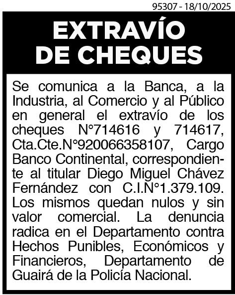 CONVOCATORIA A ASAMBLEA GENERAL ORDINARIA. DE ACCIONISTAS DISCOVER PARAGUAY S.A. RUC 80087415-3 El Directorio de DISCOVER PARAGUAY S.A. con domicilio en Avda. Santa Teresa, esq. Herminio Maldonado, Torres del Paseo, Torre 3, Piso 11, de la Ciudad de Asunción, convoca a los señores Accionistas a Asamblea General Ordinaria a desarrollarse en forma presencial el día 27 de octubre de 2025, a las 08:00 horas y a las 09:00 horas, en primera y segunda convocatoria respectivamente, en la que, previa acreditación de asistencia y representación, se tratarán los siguientes puntos del Orden del día: 1. Designación de Presidente y Secretario de la Asamblea. 2. Designación de Directores y Síndicos, y fijación de su retribución; 3. Designación de dos accionistas para suscribir el acta de la asamblea. Para asistir a las asambleas los accionistas deben depositar en la sociedad sus acciones, o un certificado bancario de depósito librado al efecto, para su registro en el libro de asistencia a las asambleas, con no menos de tres (3) días hábiles de anticipación al de la fecha fijada. En dicho lapso no podrán disponer de ellas. La sociedad les entregará los comprobantes necesarios de recibo, que servirán para la admisión a la asamblea. Los accionistas o sus representantes que concurran a la asamblea firmarán el libro de asistencia en el que se dejará constancia de su domicilio y del número de votos que corresponda. Los certificados de depósito deben especificar la clase de las acciones, su numeración y la de los títulos. El Directorio 95235/20/10/2025