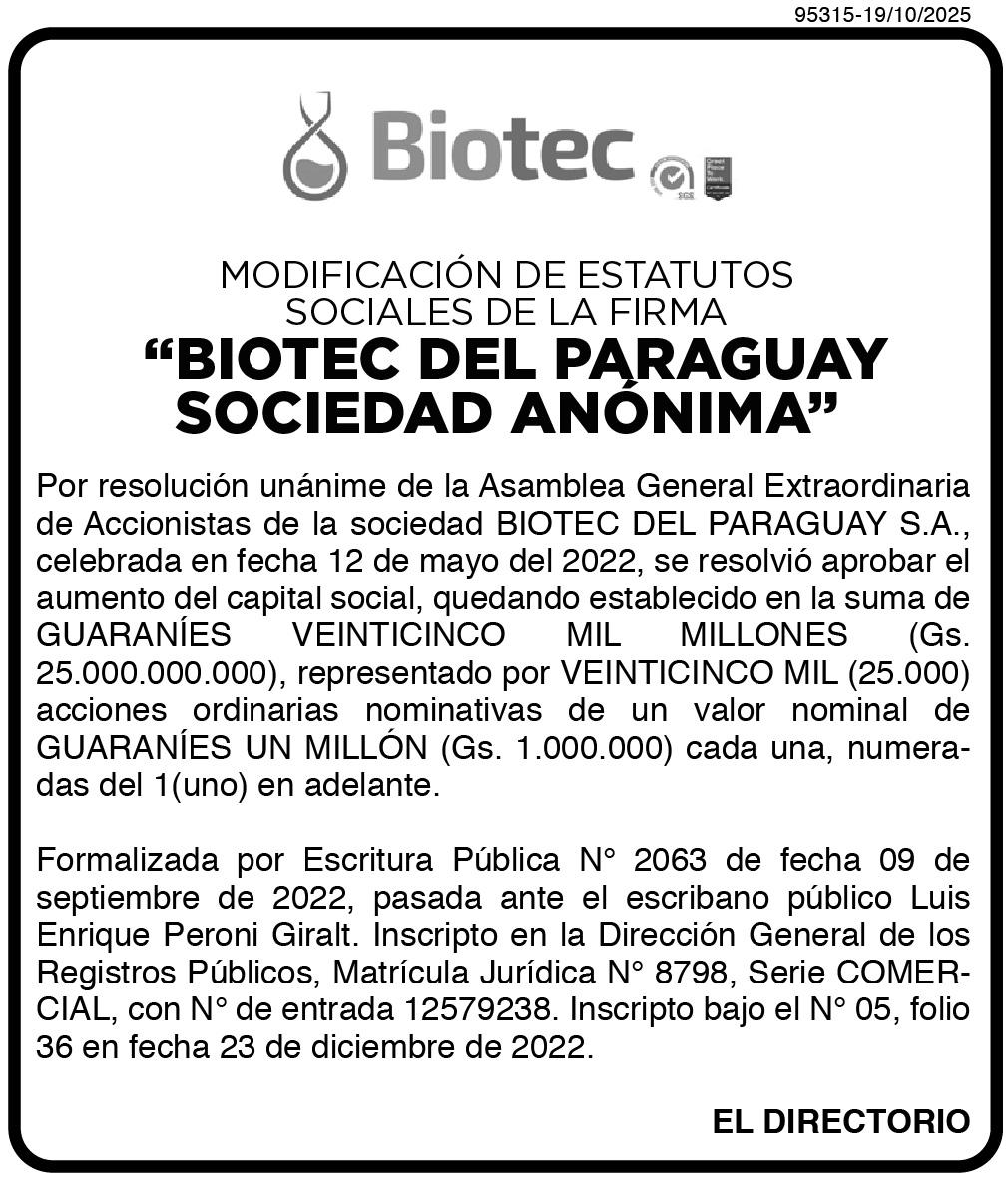 nistas deben depositar en la sociedad sus acciones, o un certificado bancario de depósito librado al efecto, para su registro en el libro de asistencia a las asambleas, con no menos de 3 (tres) días hábiles de anticipación al de la fecha fijada, todo ello en concordancia a los estatutos sociales. El Directorio, de conformidad al Art. 1082 del Código Civil Paraguayo, dispone efectuar las publicaciones correspondientes, por medio de un diario de gran circulación durante cinco (5) días corridos, con diez (10) días de anticipación por lo menos y no más de treinta (30) días contados a partir del día siguiente al último día de su publicación. Atte. El Directorio. 94972/ 18/ 10/2025