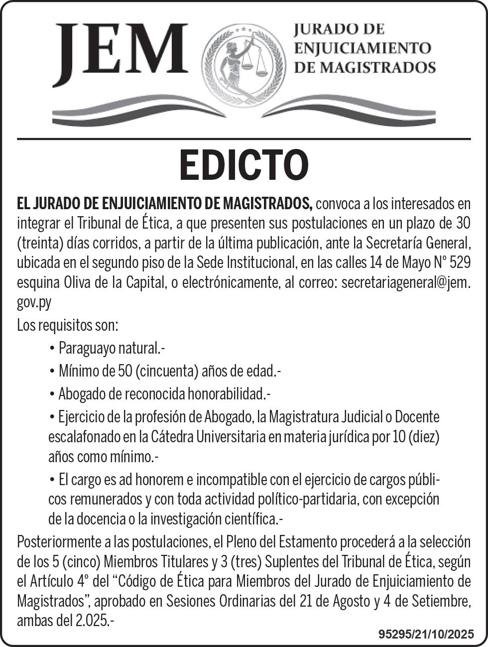 SUCESIÓN. La Jueza de Primera Instancia en lo Civil y Comercial del Vigésimo Cuarto Turno, Dra. Magali Zavala cita y emplaza por sesenta días a herederos y acreedores de la sucesión de GERTRUDIS TEJERA VIUDA DE JIMENEZ. El juicio radica en la Secretaría a mi cargo. Edgar Adrián Jara Mendoza, Actuario Judicial. Asunción, 7 de mayo de 2024. ). 95074-20/10/2025