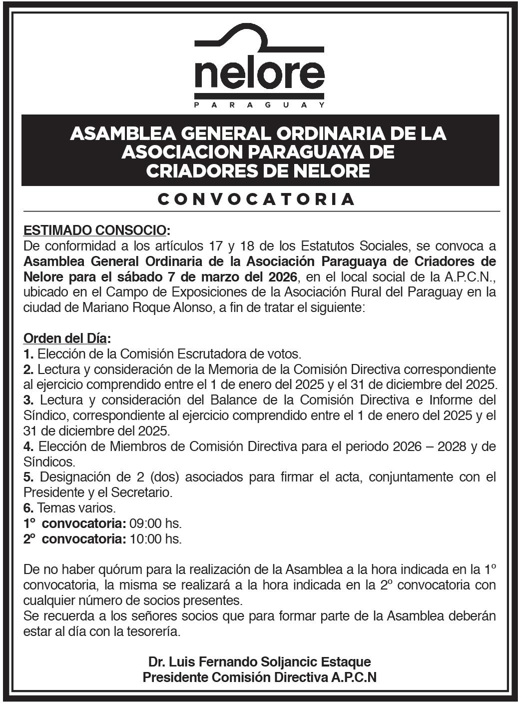 S.A. Se convoca a los Señores Accionistas a la Asamblea General Ordinaria de Accionistas que tendrá lugar el día 04 de marzo de 2026 en la sede social ubicada en Avda. Brasilia entre Tte. Villamayor y Tte. Insaurralde, de la ciudad de Asunción, a las 13:00 horas en primera convocatoria y las 14:00 horas en segunda convocatoria, para tratar el siguiente “Orden del Día”: 1. Elección de Presidente y Secretario de Asamblea. 2. Consideración de la Memoria Anual del Directorio, Balance General, Cuadro demostrativo de Pérdidas y Ganancias, Informe del Síndico y del Resultado del Ejercicio cerrado al 31 de diciembre de 2025. Tratamiento y distribución de utilidades. 3. Elección de los miembros del Directorio y elección de Síndico. Fijación de sus remuneraciones. 4. Designación de Accionistas para suscribir el Acta de Asamblea. Se recuerda a los señores Accionistas que deben depositar en las oficinas de la Sociedad sus acciones o certificados bancarios de depósito librados al efecto, con no menos de tres días hábiles de anticipación de la fecha fijada, conforme dispone el artículo 1084 del Código Civil. El Directorio./- 99500 -10/02/2026