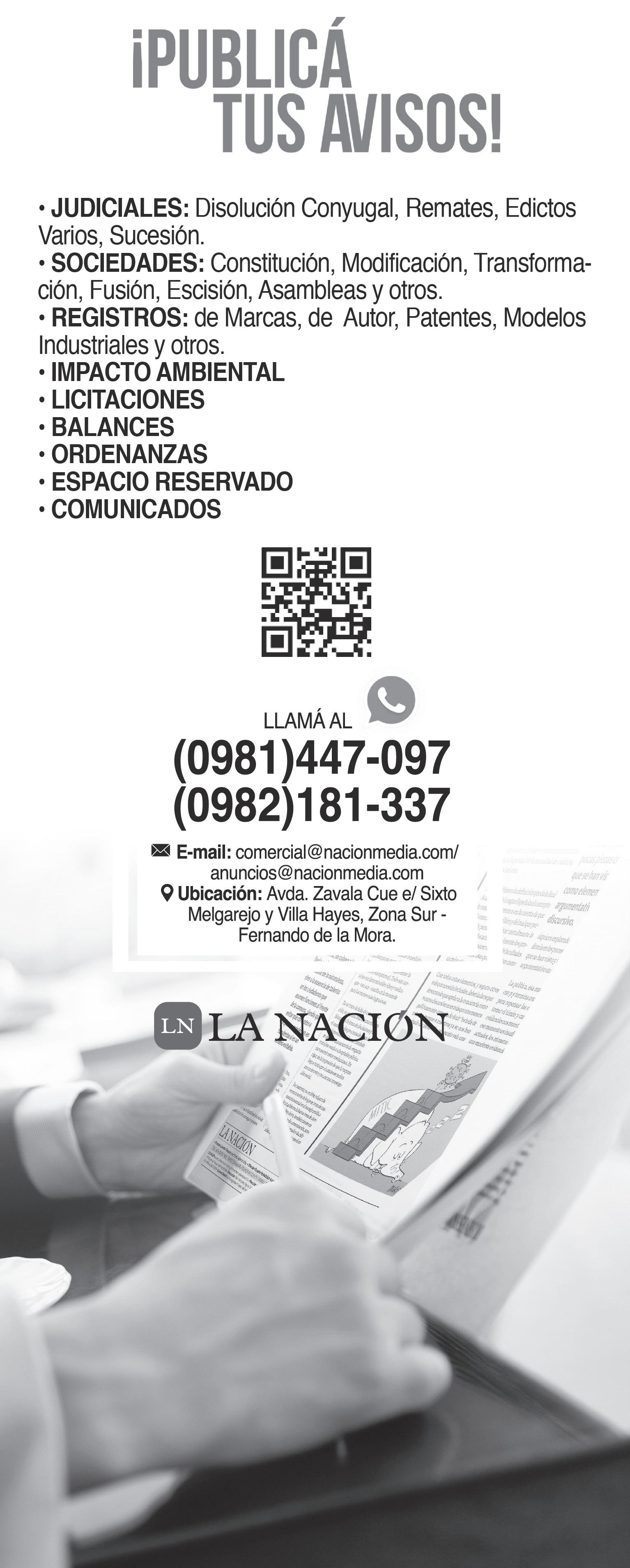 IGLESIA DE DIOS EN EL PARAGUAY CONVOCA A ASAMBLEA GENERAL EXTRAORDINARIA Y ORDINARIA. El Consejo Nacional convoca a Asamblea General Extraordinaria a realizarse el viernes 13 de Marzo. Primera convocatoria a las 14 hs y segunda convocatoria a las 14:30. Orden del día: 1. Elección de presidente y secretario de la asamblea. 2. Modificación del Estatuto Social. El Consejo Nacional convoca a Asamblea General Ordinaria para el día sábado 14 de marzo del 2026, 1° convocatoria 09:30 hs., 2° convocatoria 10:00 hs. Lugar: Iglesia de Dios “Israel” situado en Río Blanco e/ Rio Verde – B° Valle Apu'a II – Lambaré –Paraguay. ORDEN DEL DÍA 1. Elección de secretario y presidente de Asamblea 2. Lectura y aprobación del acta anterior 3. Informe de Gestión 4. Informe estadístico y financiero 5. Informe del Fiscalizador 6. Informes de Ministerios 7. Elecciones A. Supervisor Nacional periodo 2026-2030 B. Comité Ejecutivo periodo 2026-2030 compuesto por: a) Asistente Administrativo b) Asistente Financiero c) Vocal Titular y suplente 8. Puntos Varios/- 99614 -12/02/2026