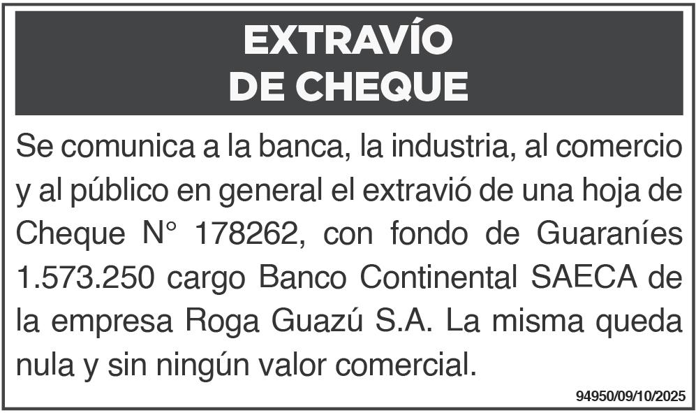 ASAMBLEA GENERAL EXTRAORDINARIA. El Directorio de la firma GRUPO DRACENA S.A. con R.U.C. Nº 80070434-7 convoca a los señores Accionistas a Asamblea General Extraordinaria a celebrarse el día 23 de octubre del 2025, a las 08:00 horas en primera convocatoria y 09:00 horas segundas convocatoria, en su sede social ubicado en km 24 Acaray Minga Guazú, con el objeto de considerar el siguiente orden del día: 1-Elección del presidente de Asamblea. 2-Designación de un secretario de Asamblea y un Accionista para suscribir el Acta conjuntamente con el presidente de Asamblea. 3-Modificación Parcial de los Estatutos Sociales. 94878- 8 al 12/10