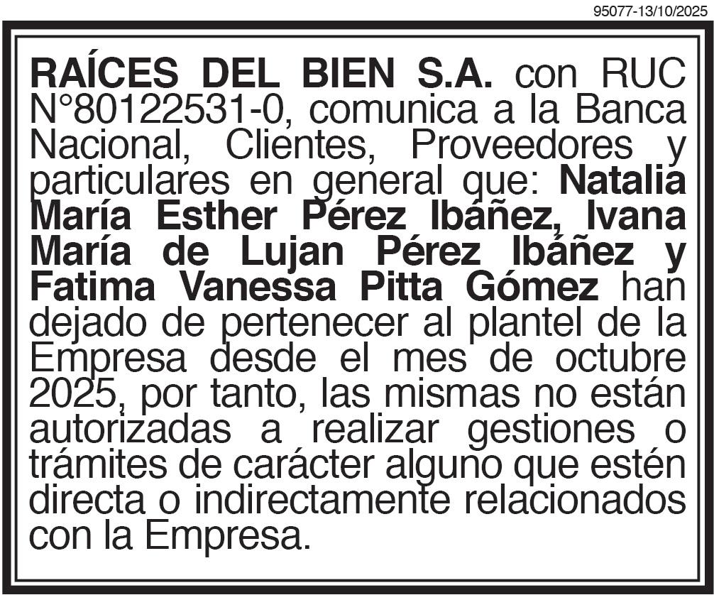 MODIFICACIÓN DE ESTATUTOS SOCIALES POR CAMBIO DE DENOMINACIÓN (TERRAVAZ S.A.E. – R.U.C. 801040140). Por Escritura Pública N.º 121 de fecha 07/07/2025, autorizada ante la N.P. María Teresa López de Aponte con Reg. 637, se formalizo la modificación de estatutos Sociales por cambio de denominación de la firma RADICE S.A.E.C.A. a TERRAVAZ S.A.E. Inscripta en el Reg. de Pers. Jurídicas y Com., Matrícula Jurídica N.º 15710, Serie Comercial. 95066 -13/10/2025.