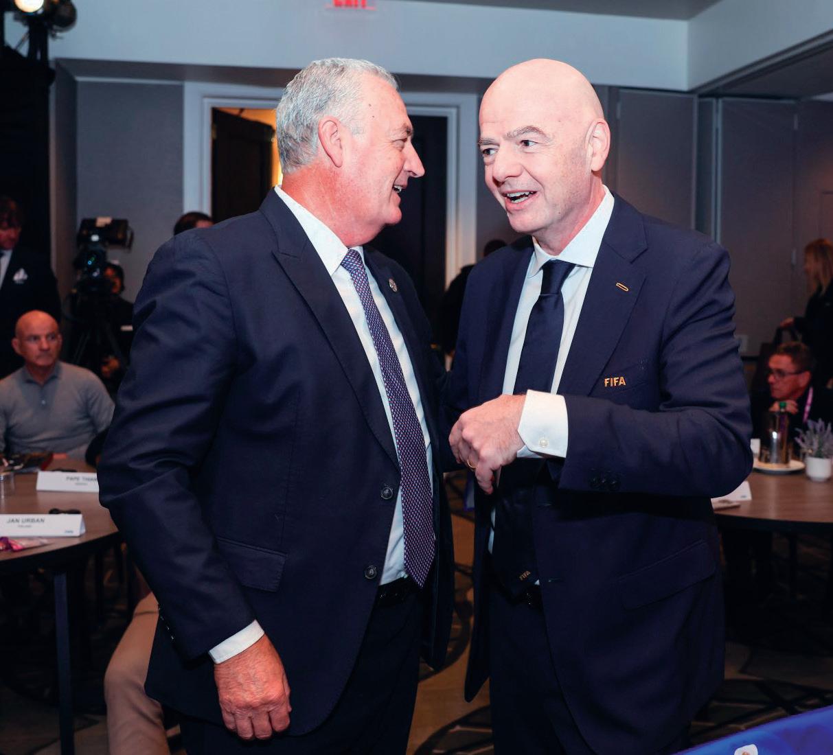 Gustavo Alfaro conversó animadamente durante la ceremonia del sorteo con Gianni Infantino, presidente de la FIFA