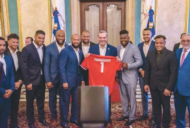 SD. El presidente Luis Abinader recibió ayer en el Palacio Nacional a los campeones de la Liga de Béisbol Profesional de la República Dominicana, los Tigres del Licey, que ahora representarán al país en la Serie del Caribe, que se jugará del 2 al 10 de febrero en el Gran Caracas, Venezuela. En la foto, Sergio Alcántara, Esmil Rogers, Mel Rojas Jr., Emilio y Jorge Bonifacio, Abinader, Michael De León y los coaches Gilbert Gómez y Anderson Hernández y Vitelio Mejía. P27