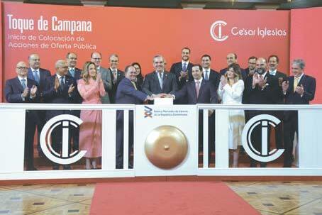 p Con el tradicional toque de campana, encabezado por el presidente Luis Abinader, se oficializó ayer la colocación en el mercado de acciones de oferta pública de la empresa dominicana César Iglesias, disponibles a través de BHD Puesto de Bolsa e Inversiones Popular-Puesto de Bolsa, como colocadores, y de Alpha Inversiones y PARVAL, como distribuidores. P14
