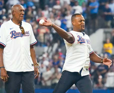 ARLINGTON, Texas. El ex tercera base dominicano Adrián Beltré, quien será exaltado al Salón de la Fama de Cooperstown el próximo domingo, hizo el lanzamiento de la primera bola en el Juego de Estrellas que se celebró ayer en el Globe Life Field, de esta ciudad. A la izquierda, aparece Ferguson Jenkins, exlanzador de las Grandes Ligas.