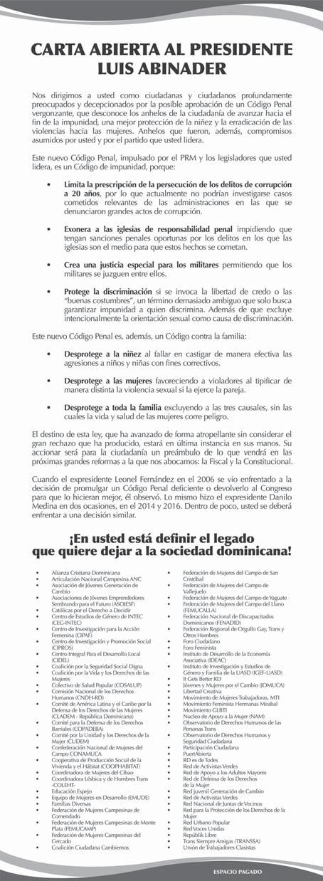 lesiona los intereses de la ciudadanía en general y de las mujeres en particular”. Solicitó incluir tres causas como eximentes de responsabilidad penal para abortar, en los casos en que se prevea la necesidad, así como asegurar la atención médica y los servicios sanitarios requeridos.