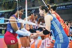 Dominicana y China se saludan tras el partido del Preolímpico mundial de 2023.