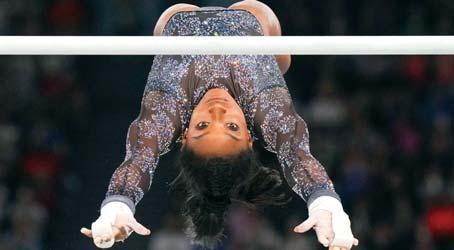 Simone Biles compite en las barras asimétricas en la ronda de clasificación en el Bercy Arena.