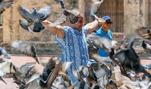 SANTO DOMINGO. Un turista levanta sus brazos y deja caer maíz como alimento para las palomas en el Parque Colón, frente a la Catedral Primada de América, llevándose un bonito recuerdo de su visita a la capital de la República Dominicana, durante un caluroso fin de semana en el Distrito Nacional. Centenares de turistas visitan diariamente la Ciudad Colonial, donde disfrutan de un gran ambiente y de todo su legado histórico.