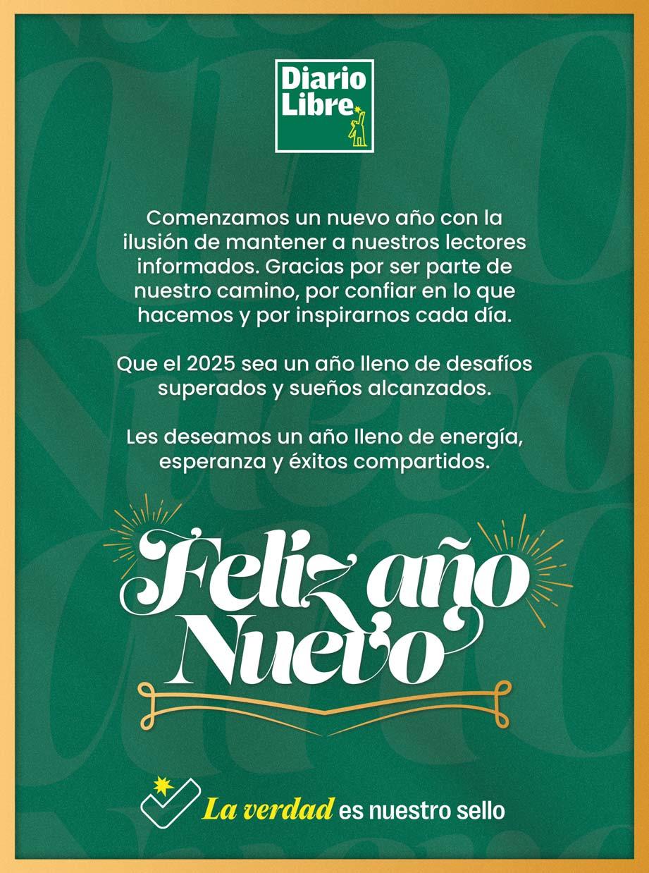 SANTO DOMINGO. El año 2024 cierra sus puertas y da paso a un 2025 que promete estar lleno de retos en diferentes sectores del ámbito nacional para todos los dominicanos, que trabajan arduamente para lograr el desarrollo del país y que luchan para salir adelante. En esta última edición del año, Diario Libre felicita a todos los que diariamente dan lo mejor de sí mismos para salir adelante junto a sus familias.