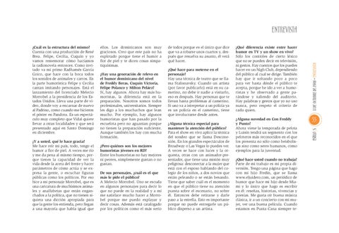 ¿Qué diferencia existe entre hacer humor en TV y un show en vivo? Sólo los controles de cierto léxico que no se pueden decir en televisión, ni gestos. Hay cuentos que los puedes hacer en un Nigh Club, dependiendo del público al cual se dirige. También hay que ir soltando poco a poco para ver hasta dónde el público te acepta, porque he ido a ver a humoristas y he observado a gente parándose y saliendo del auditorio. Hay palabras y gestos que yo no uso nunca, pero respeto el criterio de cada quien. ¿Alguna novedad en Con Freddy y Punto? Ahora viene la temporada de pelota y Luisín tendrá un segmento con los peloteros más reconocidos en el que los presenta no sólo como beisbolistas sino como seres humanos, como ejemplos para la juventud. ¿Qué hace usted cuando no trabaja? Parte de mi trabajo es mi propia diversión. Tengo una página que hago con mi hijo Fredín, que se llama www.eljuidero.com, un periódico de humor que hace mi hijo desde Miami y lo único que hago es escribir en él: reseñas, historias, vivencias y poesías. Me gusta oír buena música clásica, ir a un concierto con mi mujer, ver una buena película. Cuando estamos en Punta Cana siempre te-