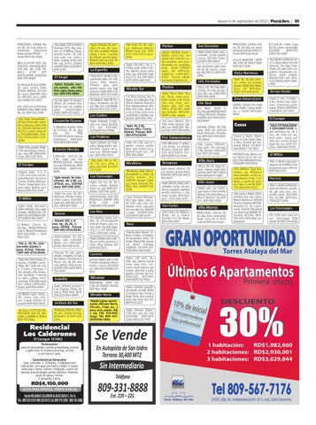 Apto. 1 hab., sala-com, baño, kichenet, serv. agua incluido., RD$10,000. Inf. 809-532-0127/809-2584752/809-481-0307. El Millón: 232m2, 3h, 2b,2pq. RD$27.000.00 Juan C. Reyes/Timehomes 809-565-9192 / 829890-7521 2do. p., 2h, 1b., c/ser. con baño, balcón, 1 parq., $17mil. Patroni. 809-482-0714/8240. Apto tipo Pent house, 2 niveles, 250Mts const., 4hab., 4b, + hab. serv con b., 2 salas, 2 terrazas, + cto. estudio, 2Pq, tinaco, sist. parábola + alarma en apto., planta elect. a/comun, $28,000 mant incl. (2Dep.) 809-8469666, 829-994-9994 El Millon: apto. 3hab., 2b., c/serv., sala, com., coc., 2 parq., $22mil. Sr. Joseph 809-840-4019. SE ALQ. 2 ESTUDIO EN PRIVADA 16A EL MILLON, LLAMAR A JESUS 809-707-0011.