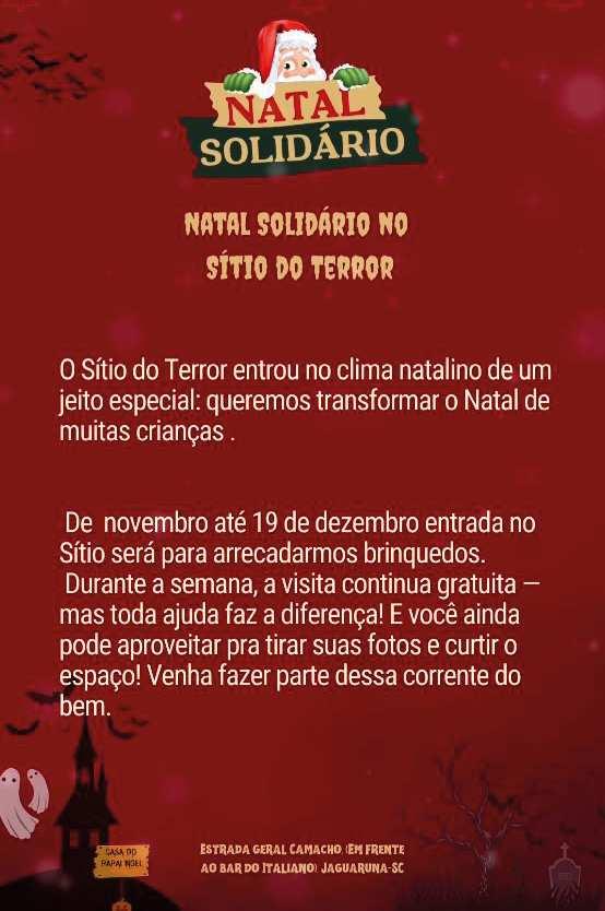 OSítio do Terror celebra o espírito natalino de forma especial, com o intuito de transformar o Natal de muitas crianças. Entre 1º de novembro e 19 de dezembro, a entrada no Sítio será destinada à arrecadação de brinquedos. Durante a semana, as visitas continuam gratuitas, mas a colaboração de todos é fundamental para fazer a diferença na vida de quem mais precisa. Os visitantes são convidados a trazer brinquedos novos ou usados, em boas condições, para que possam ser doados a crianças carentes.Além de contribuir para uma causa nobre, o público também pode aproveitar para tirar fotos e desfrutar das atrações do espaço, que ganha um toque mágico nesta época do ano. Venha fazer parte dessa corrente do bem e ajude a espalhar alegria neste Natal. Juntos, podemos fazer a diferença e proporcionar momentos de felicidade para muitas crianças. Participe!