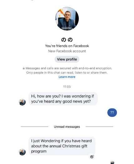 Frases como “Gostaria de saber se você já recebeu alguma notícia boa?” e “Gostaria de saber se você já ouviu falar do programa anual de presentes de Natal” escritas em inglês foram enviadas usando a foto e nome do prefeito.