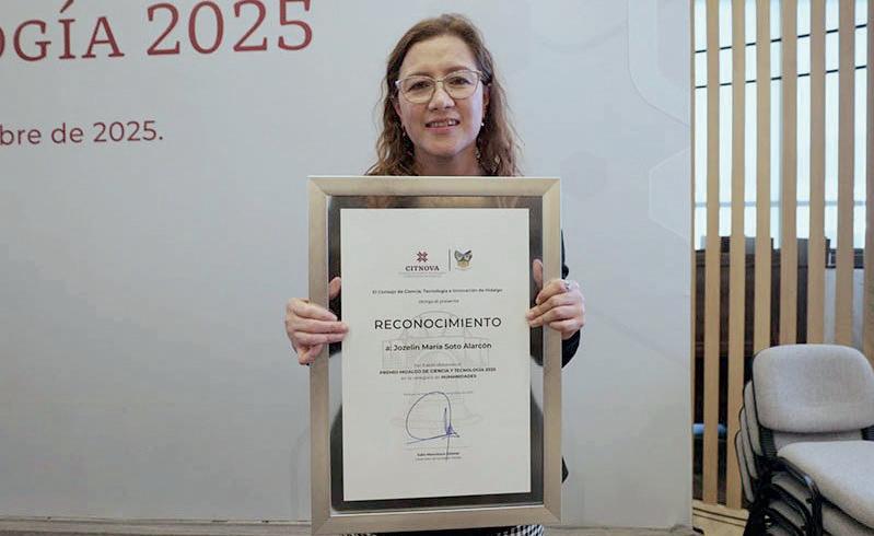 Derivado de su trabajo con productores de aguamiel y maguey para mejorar los procesos productivos, además de fomentar la equidad de género en diversas cooperativas y comunidades, Jozelin María Soto Alarcón, profesora investigadora de la Universidad Autónoma del Estado de Hidalgo (UAEH) recibió el Premio Hidalgo de Ciencia, Tecnología 2025 en la Categoría Humanidades, de parte del Consejo de Ciencia, Tecnología e Innovación de Hidalgo (Citnova).