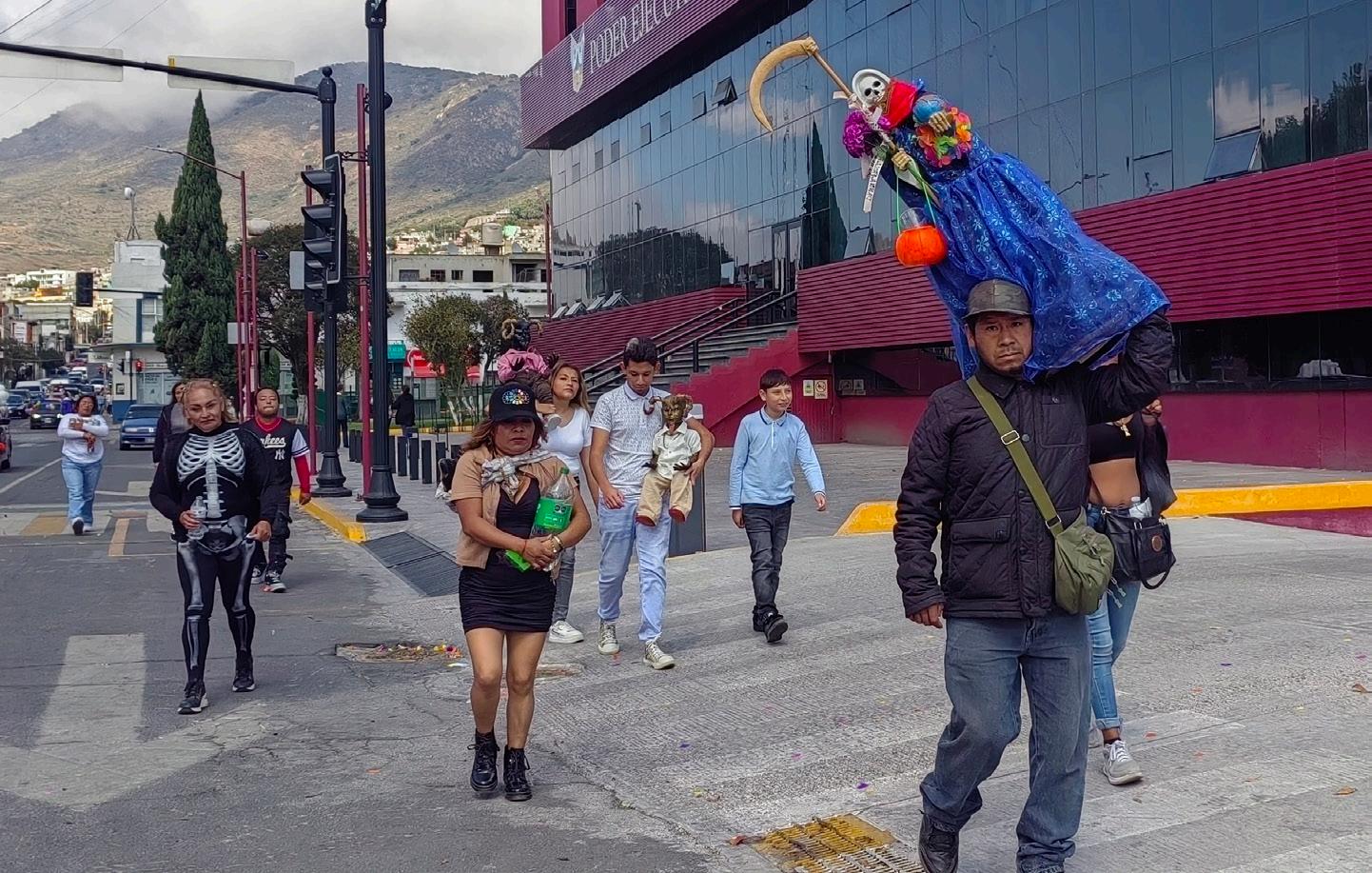 En el marco del Día de Muertos, cientos de devotos y creyentes de “La Santa Muerte”, realizaron la tradicional procesión por las calles del primer cuadro de la ciudad de Pachuca, con ellos decenas de imágenes de “la Madrina”, “la Niña Blanca”, “la Flaquita”, como le dicen, fueron llevadas como símbolo de fe, agradecimiento y promesas que cumplir.