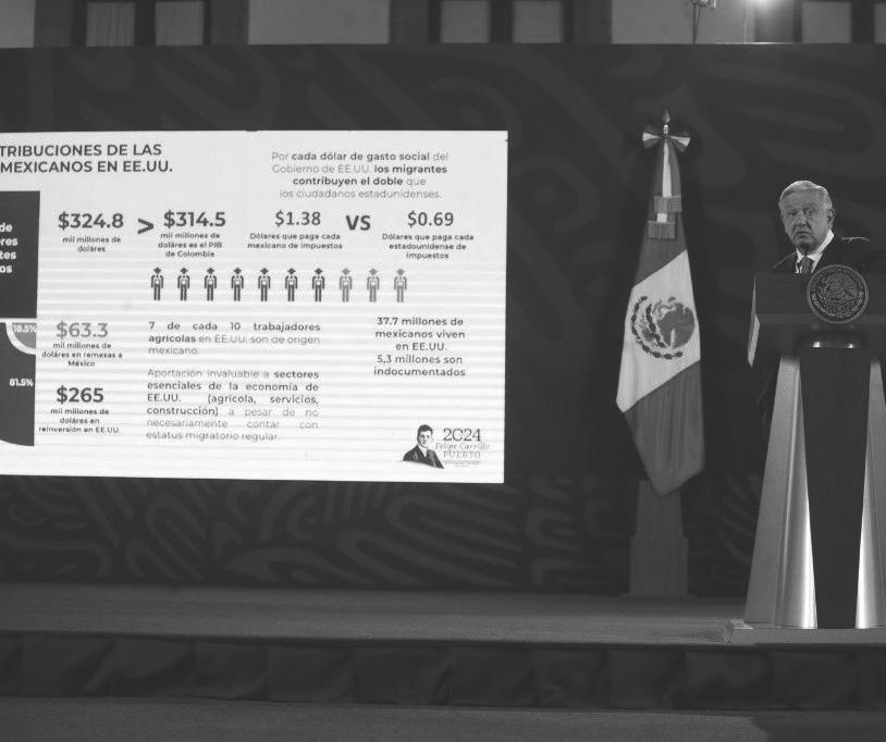 De esa cifra, 265 mil millones de dólares lo reinvierten en la economía estadunidense y 63.3 mil millones son enviados como remesas a México. Sin embargo, planteó el tabasqueño, 2024 se espera cerrar con más de 65 mil millones de esa divisa.