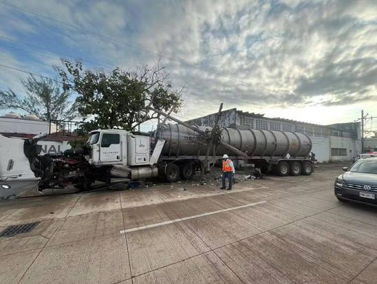 Un aparatoso accidente se registró durante la madrugada sobre la carretera Costera del Golfo, luego de que el chofer de un tráiler que transportaba sustancias químicas perdiera el control y terminara impactándose contra dos postes, y cerca de estrellarse contra las oficinas de la Guardia Nacional en Coatzacoalcos.