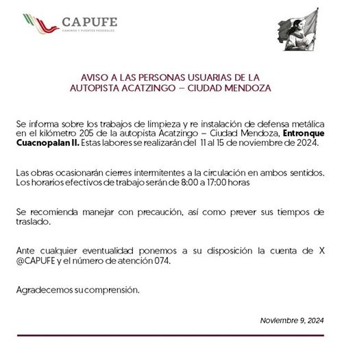A través de un comunicado compartido en su cuenta de X, antes Twitter, la dependencia federal detalló que los cierres serán en ambos sentidos, a la altura del kilómetro 205 del tramo AcatzingoCiudad Mendoza, en el entronque Cuacnolapan II.
