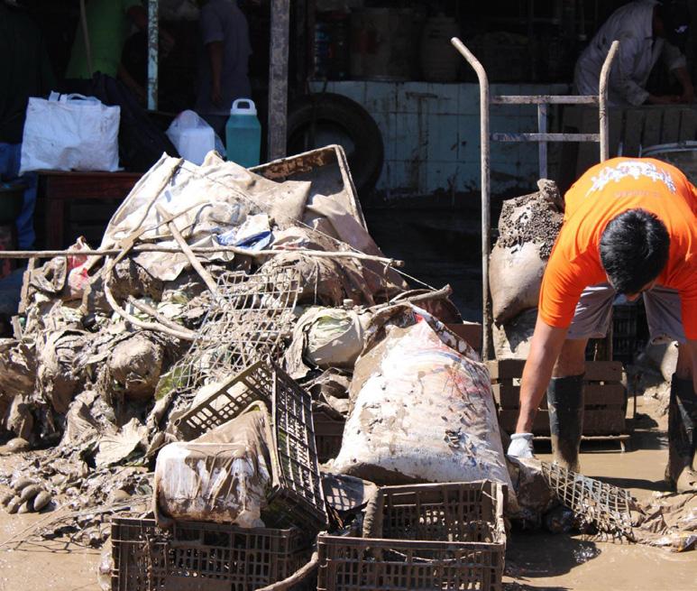 “Cada bodega tenía entre 70 y 80 toneladas de mercancía. Todo está perdido. Necesitamos maquinaria pesada para retirar el lodo y sacar los desechos”, contó Amado, uno de los comerciantes afectados, mientras intentaba rescatar lo poco que quedó en pie. El lodo seco y el olor a descomposición se han vuelto parte del paisaje.