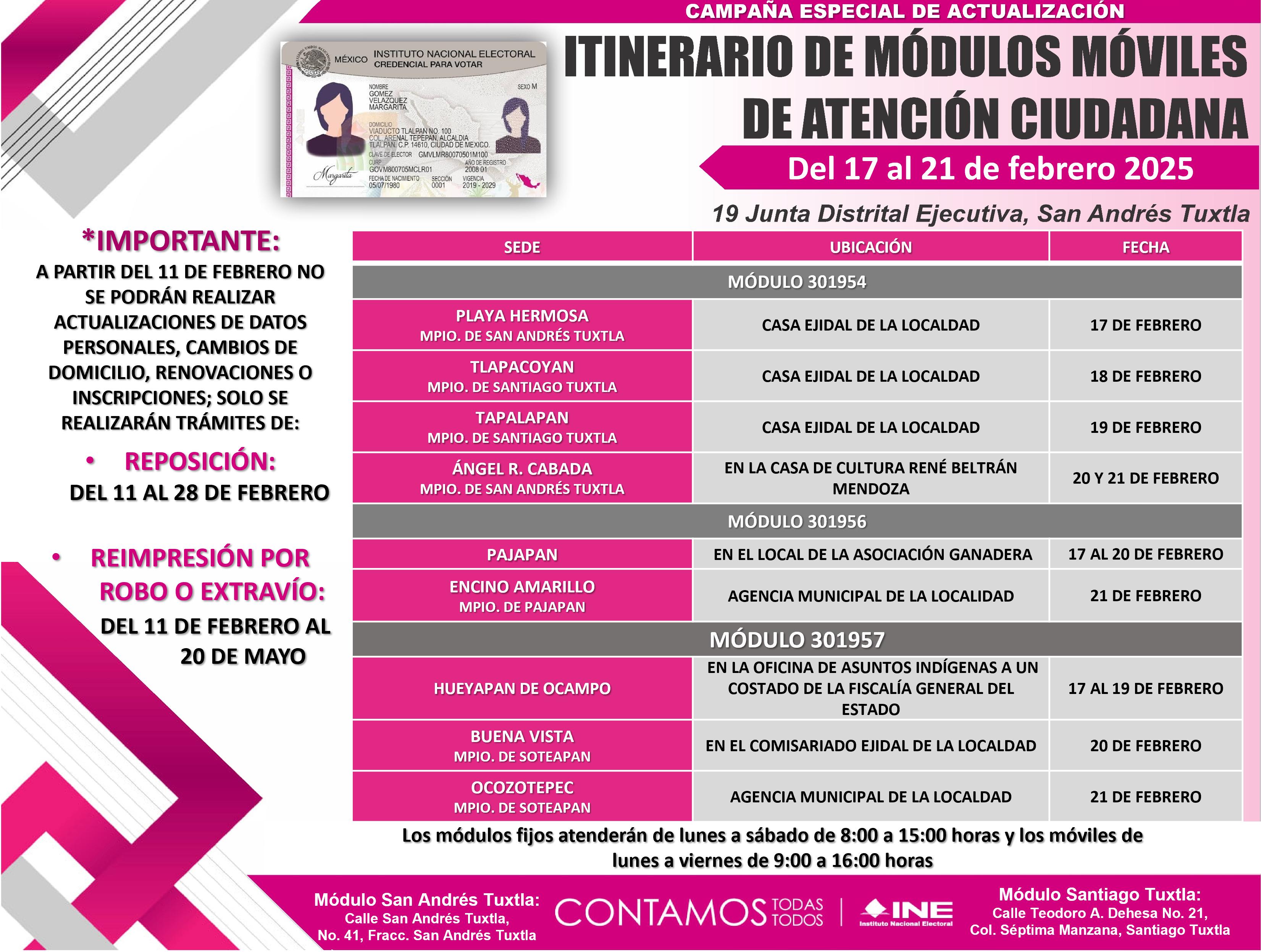 Los módulos itinerantes también funcionarán en Pánuco, Tantoyuca, Huayacocotla, Chicontepec, Álamo Temapache, Cerro Azul, Naranjos-Amatlán, Poza Rica, Tuxpan y Papantla.