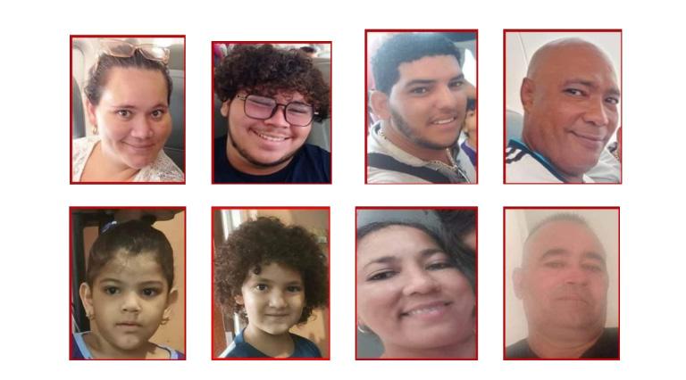 La Agencia Estatal de Investigaciones y la Comisión Local de Búsqueda de Personas emitieron las fichas la noche de este sábado 21 de septiembre. El grupo de personas provenientes de Cuba está conformado por Onel Juan Samon Reyes, de 34 años; Yereny Pompova Leiva, de 43; Yosvany González Leiva, de 53; Dairon Micher Jiménez Pompova, de 18; Heily Jiménez Pompova, de 25 y Micher Jiménez Echemendia