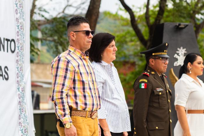 Educación, el profesor Félix Raymundo Lucho Morales. Realizando la semblanza histórica donde se recordó la evolución que ha tenido el escudo nacional y la bandera mexicana desde que el ejército trigarante adoptará los colores verde, blanco y rojo, hasta la incorporación del águila devorando la serpiente, posada sobre el nopal, el