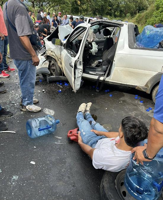 una de las unidades involucradas. La tercera persona lesionada fue identificada como “Toño”, conductor de un vehículo que transportaba garrafones de agua. Hasta el momento se desconocen las causas exactas que provocaron el accidente. Los tres afectados fueron trasladados al hospital de San Andrés Tuxtla para recibir la atención médica correspondiente. Elementos de Protección Civil de Santiago Tuxtla acordonaron el área para evitar riesgos y permitir las labores de auxilio.