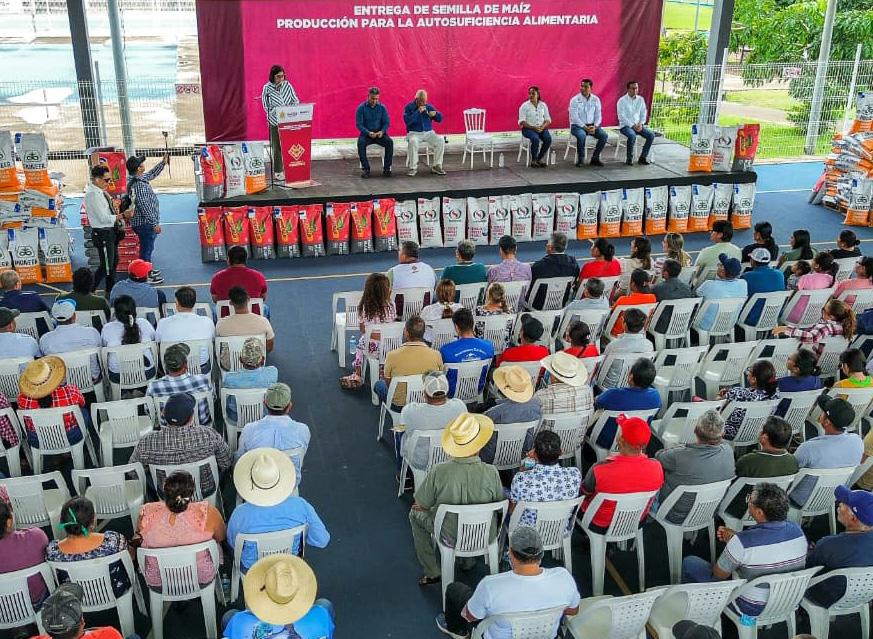 acopio con el fin de mejorar la producción y rentabilidad de los cultivos. Se enfatizó el compromiso del gobierno estatal de apoyar directamente a los productores y de mantener el precio de garantía del maíz. En el marco de esta entrega de beneficios, los productores fueron invitados a cuidar los equipos y aprovechar los apoyos ofrecidos, al mismo tiempo que se realizó una entrega simbólica de apoyos a productores de diferentes municipios, en donde las autoridades municipales agradecieron a la gobernadora por su apoyo al campo y a los productores.
