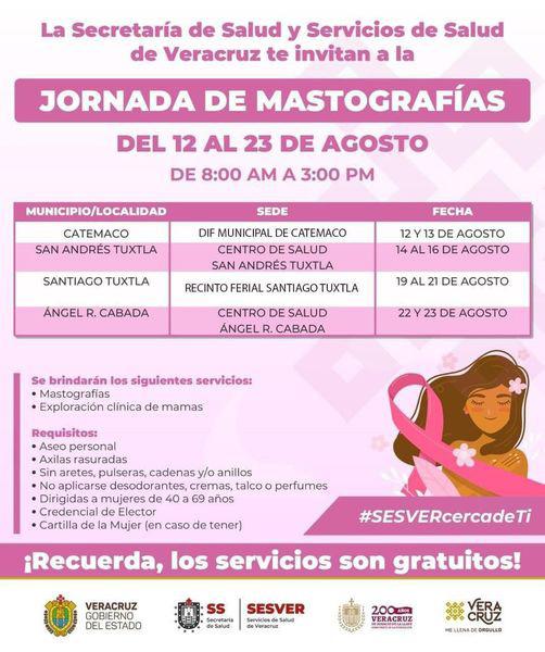 La Secretaría de Salud del Gobierno del Estado de Veracruz en coordinación con el Gobierno Municipal de Catemaco invitan a la Jornada de Mastografías. 12 y 13 de Agosto DIF Municipal de Catemaco 8:00 a.m a 3:00 p.m Consulta la imagen para más información sobre estas jornadas.