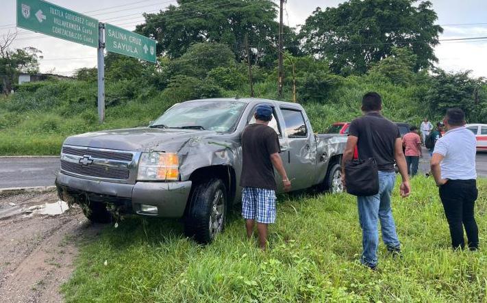 en la carretera 185 Transístmica, tramo Acayucan-Sayula, a la altura del entronque a la caseta de cobro, el conductor de una camioneta Chevrolet Silverado terminó volcado tras ser golpeado por otra unidad a la que le cedió el paso. El conductor impactó contra una señalización y posteriormente terminó