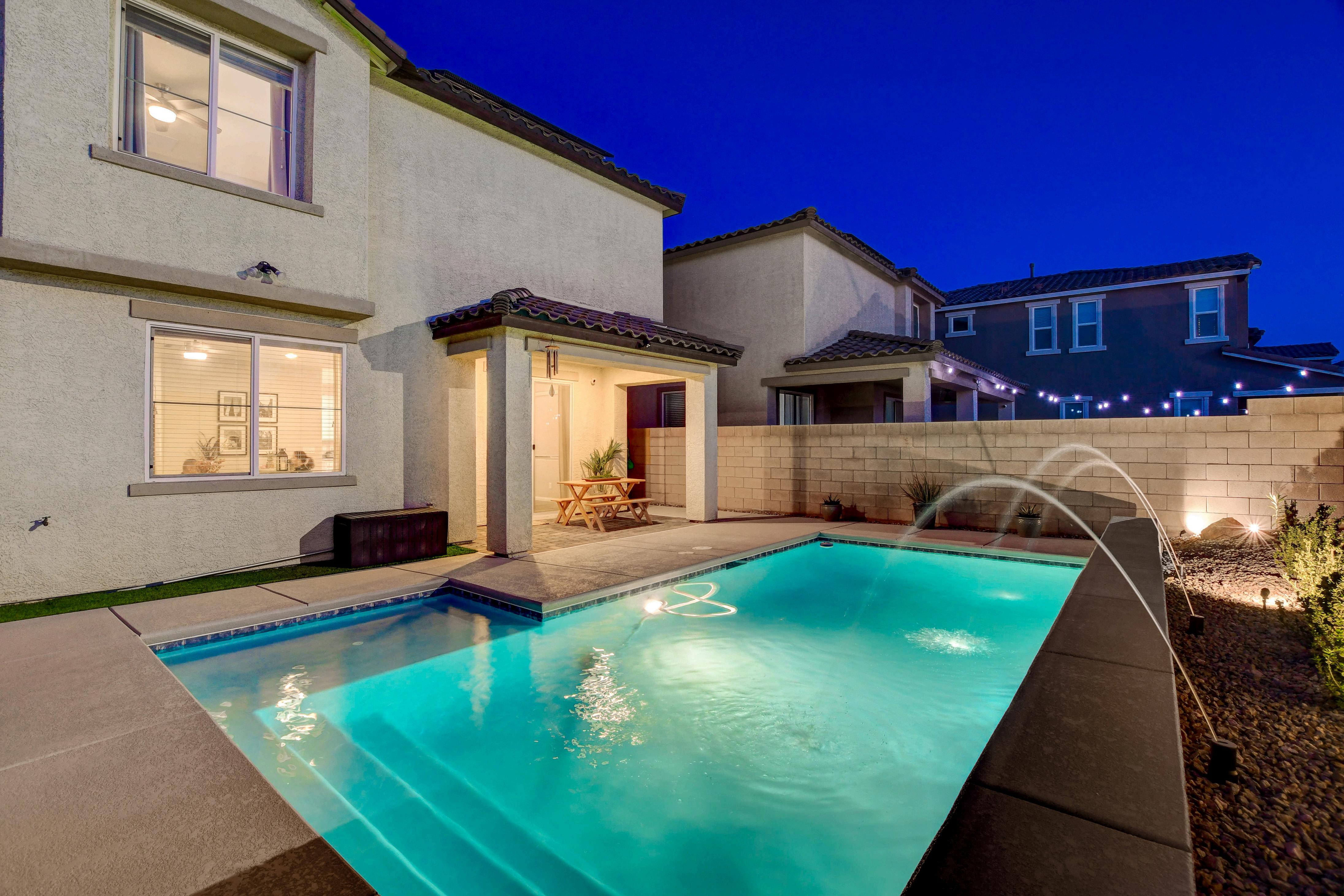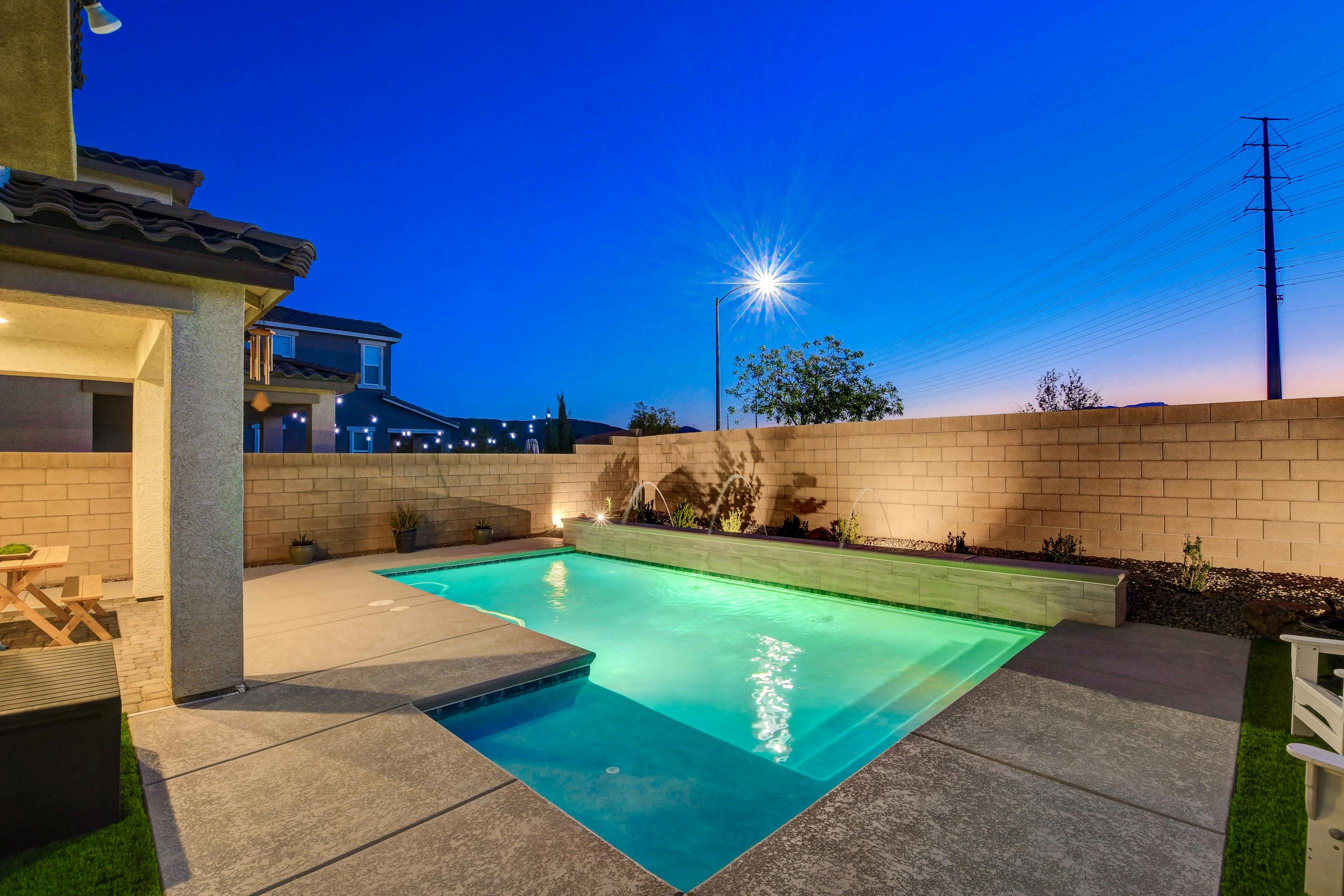 A s d u s k s e t e s t h e b a c k y a r d t r a n s f o r m s i n t o a s e r e n e r e t r e a t i l u m i n a t e d b y s u b t e l a n d s c a p e g h t i n g a n d t h e g e n t l e g l o w f r o m t h e h o u s e T h e c l e a r t r a n q u w a t e r s o f t h e p o o l r e f e c t t h e t w i l g h t s k y c r e a t n g a c a l m n g a t m o s p h e r e t h a n v t e s e v e n i n g r e a x a t i o n T h s o u t d o o r s e t t i n g s p e r f e c t l y e q u p p e d f o r b o t h q u e t n g h t s a n d s o c a l g a t h e r i n g s u n d e r t h e s t a r s