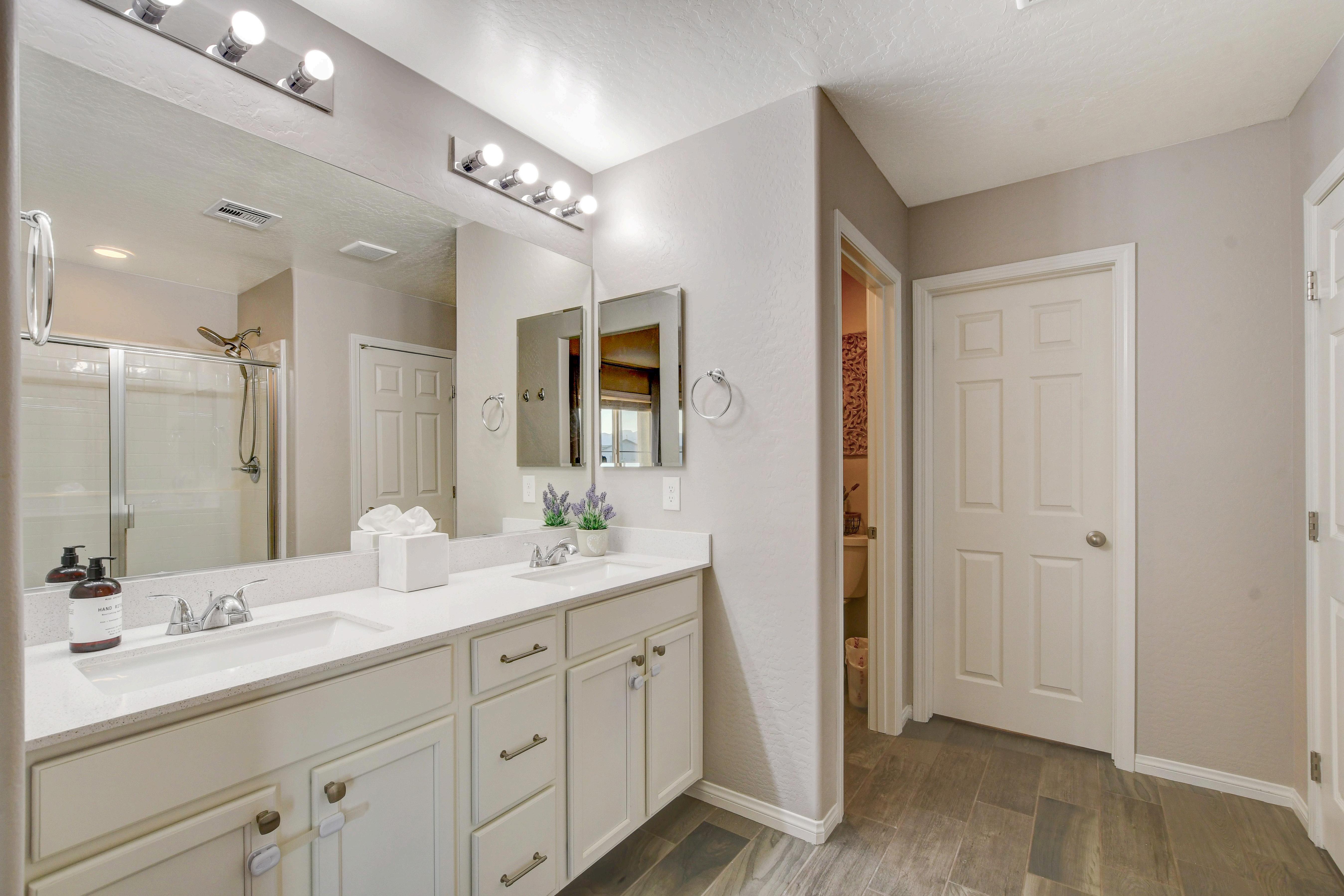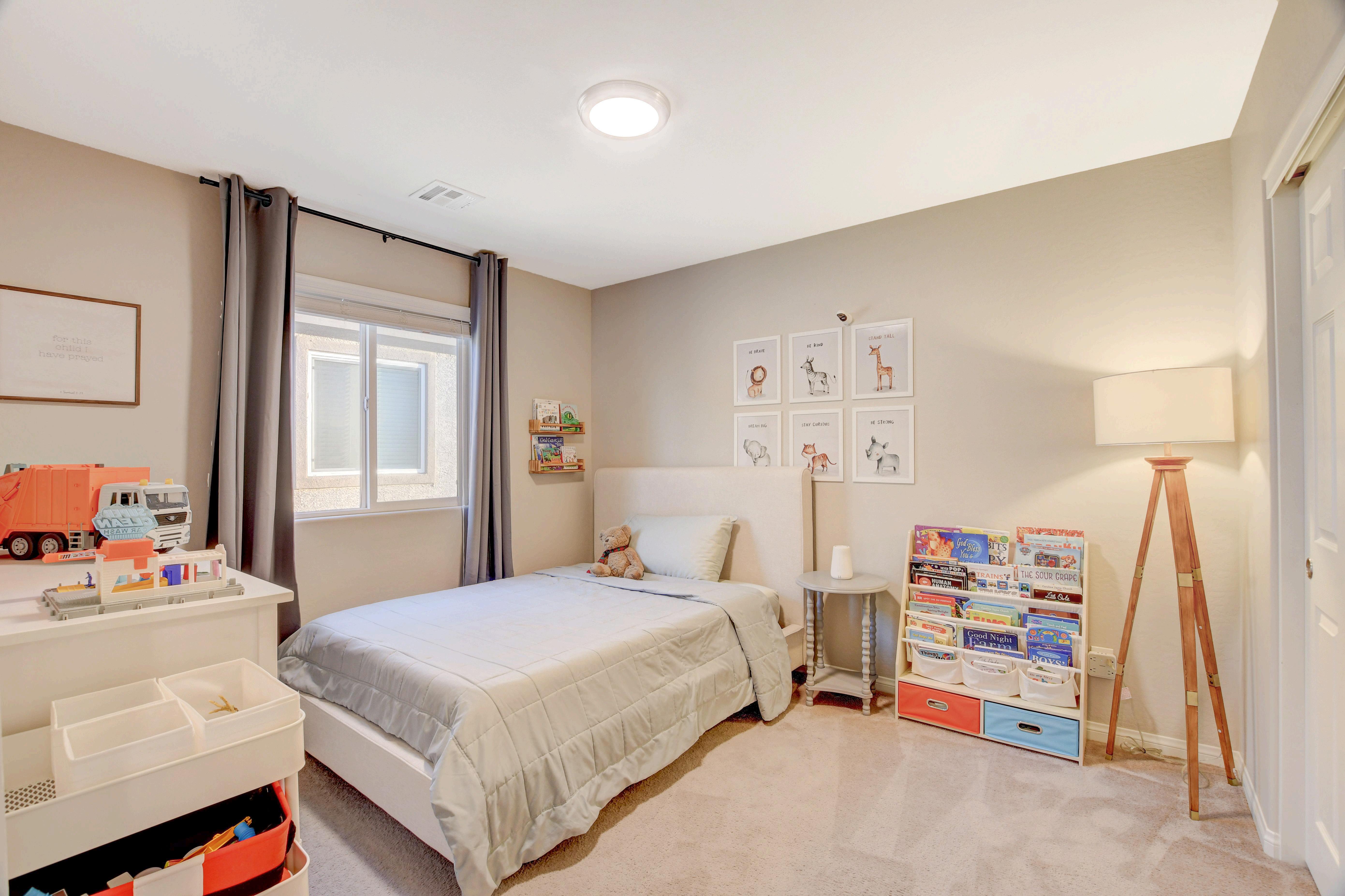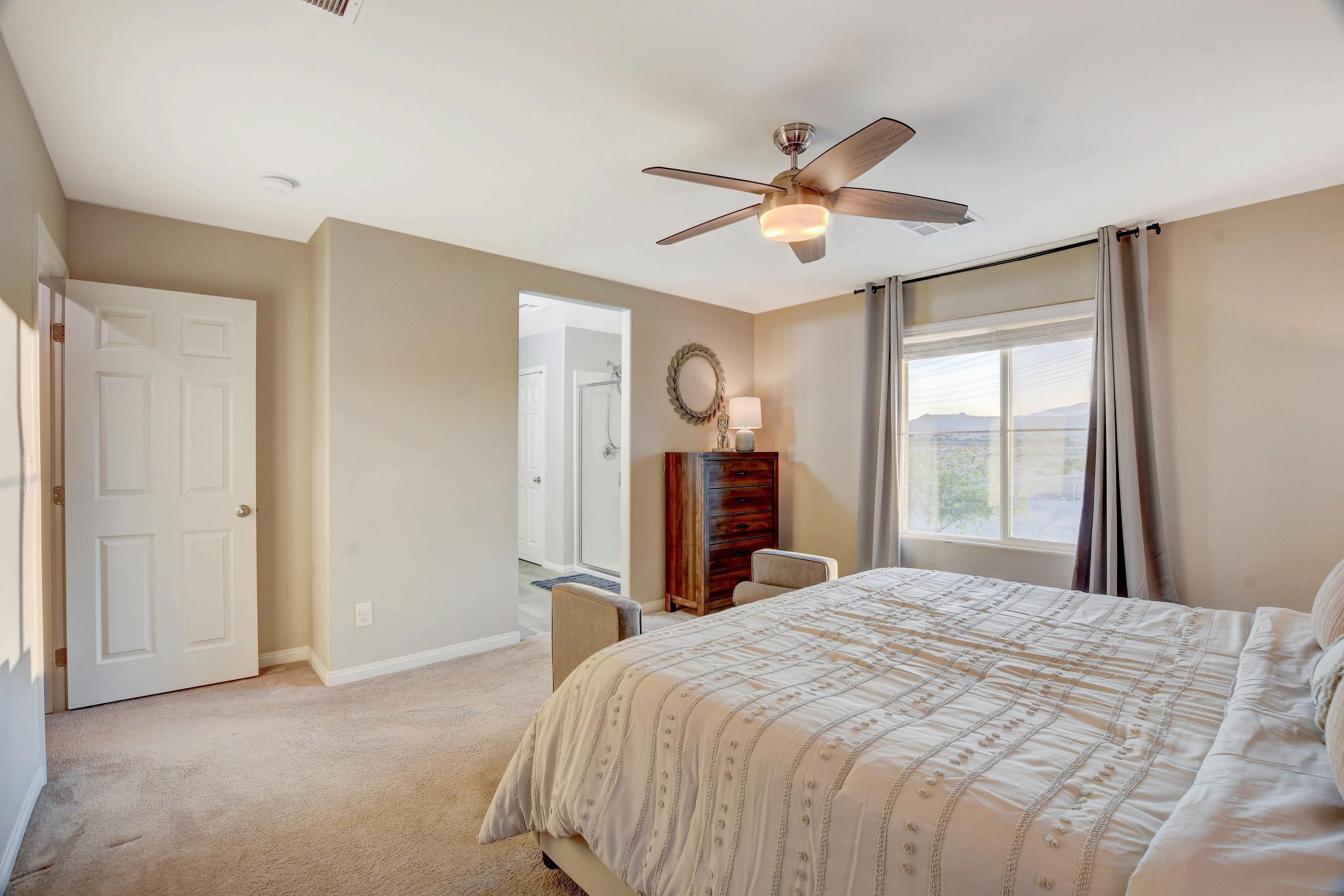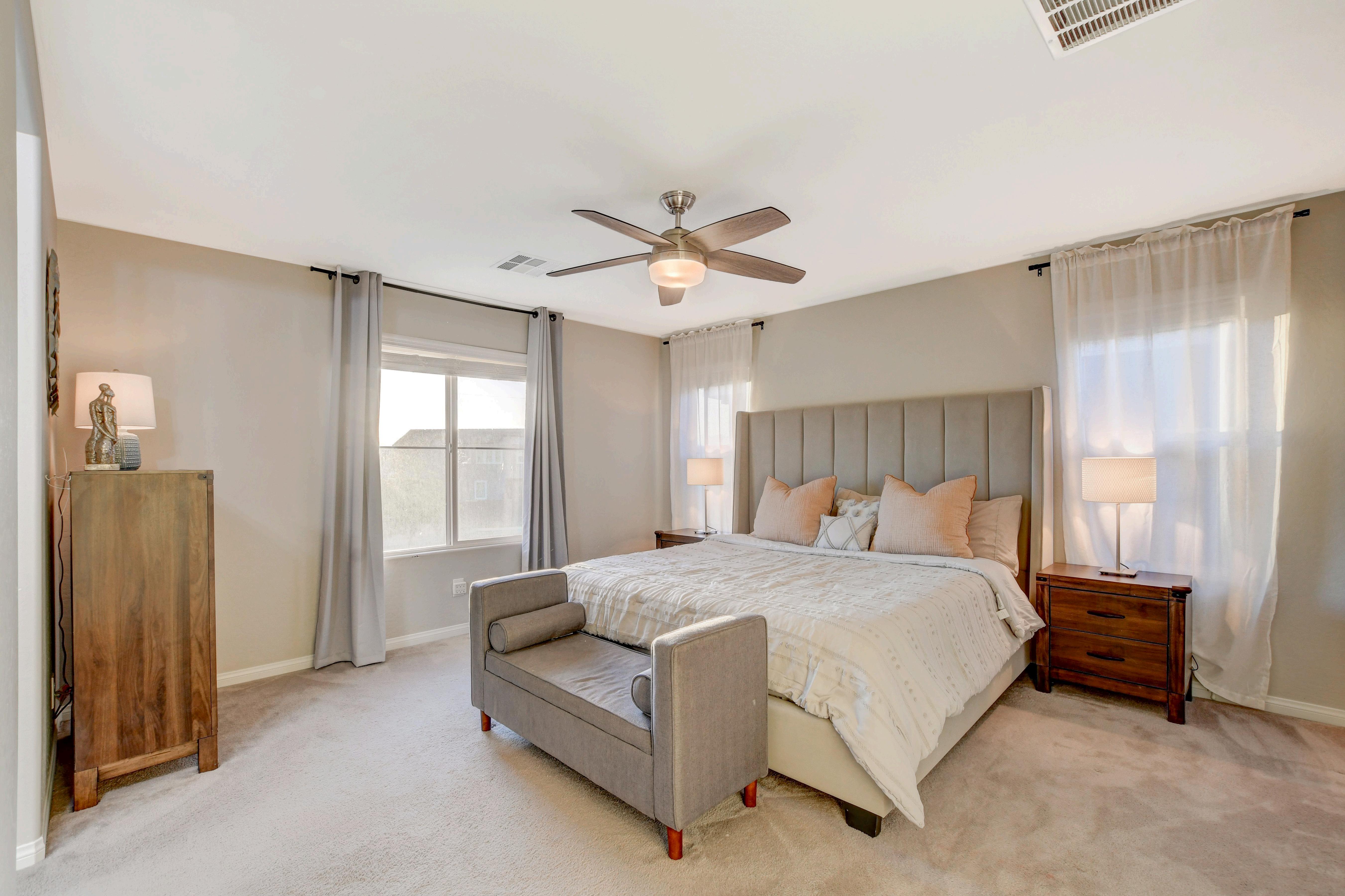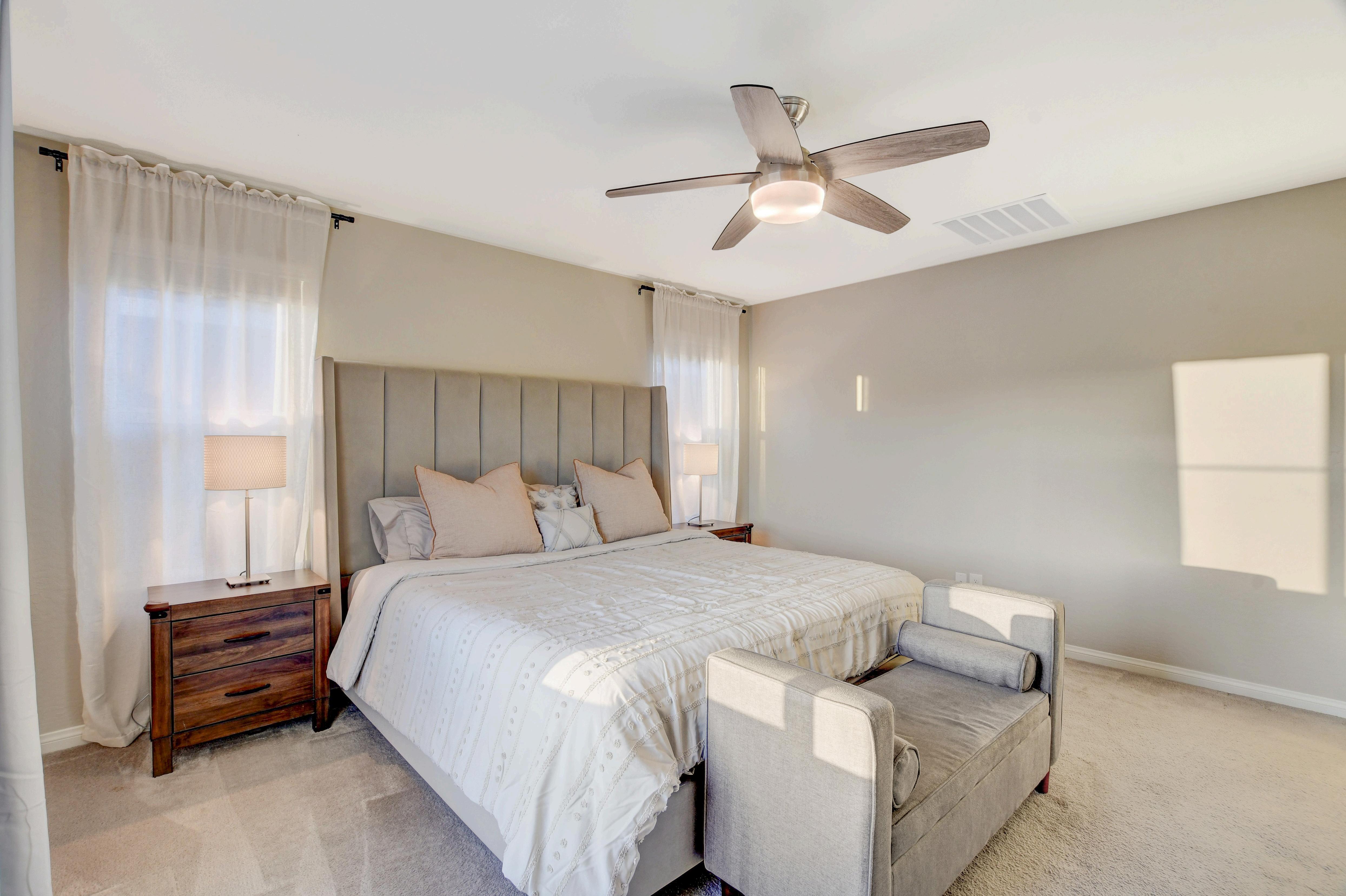 P L U S H M A S T E R R E T R E A T T h e p r i m a r y b e d r o o m b e n d s c o m f o r t w t h a t o u c h o f m o d e r n s o p h s t i c a t o n p r o v d i n g a t r a n q u l r e t r e a t f o r r e a x a t o n A a r g e b e d a n c h o r s t h e r o o m , c o m p e m e n t e d b y s o f t , n e u t r a l - t o n e d t e x t l e s a n d a p l u s h c a r p e t t h a t a d d s w a r m t h u n d e r f o o t A m p e n a t u r a l g h t f o o d s t h e s p a c e f r o m m u l t p e w i n d o w s e a c h d r e s s e d n e e g a n t g h t - d i f f u s i n g c u r t a n s t h a e n h a n c e p r i v a c y w h e s o f t y l l u m i n a t n g t h e r o o m