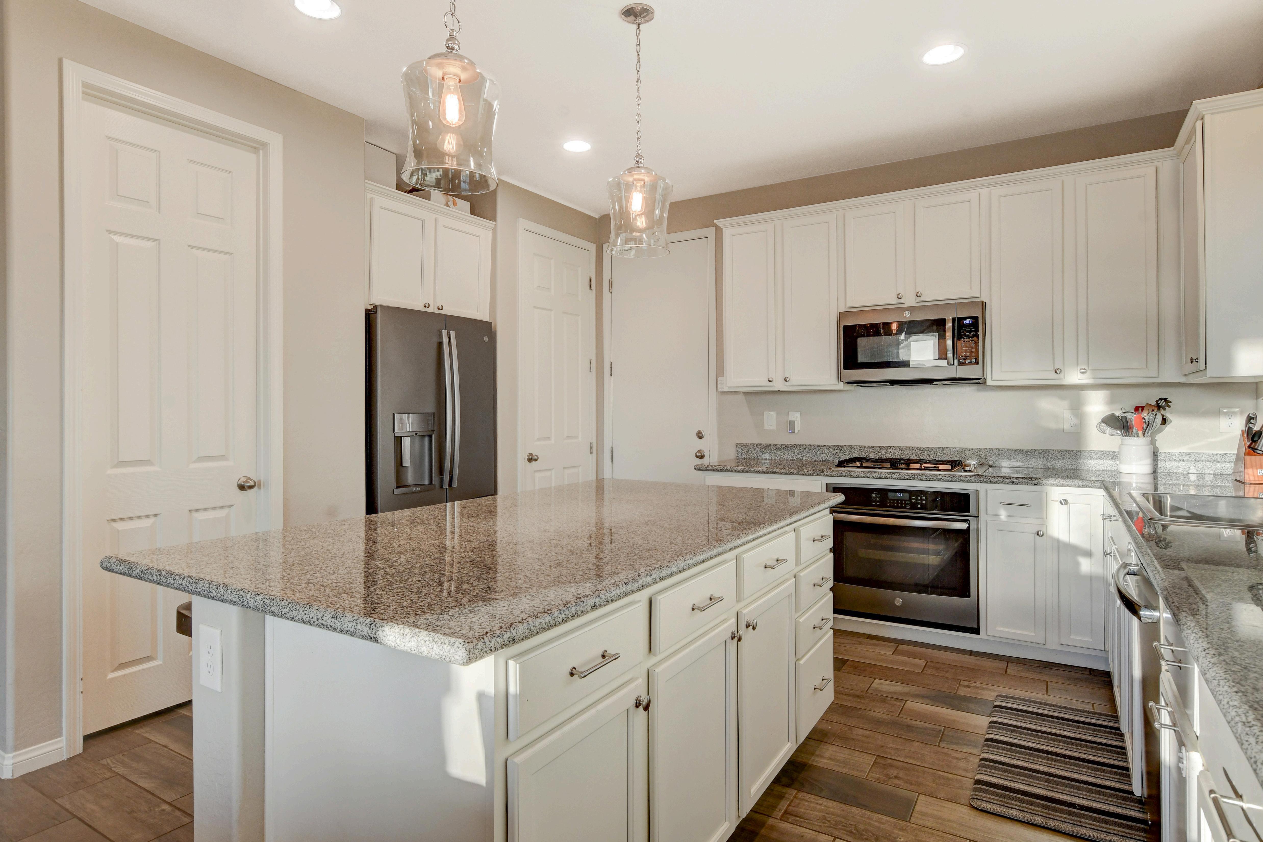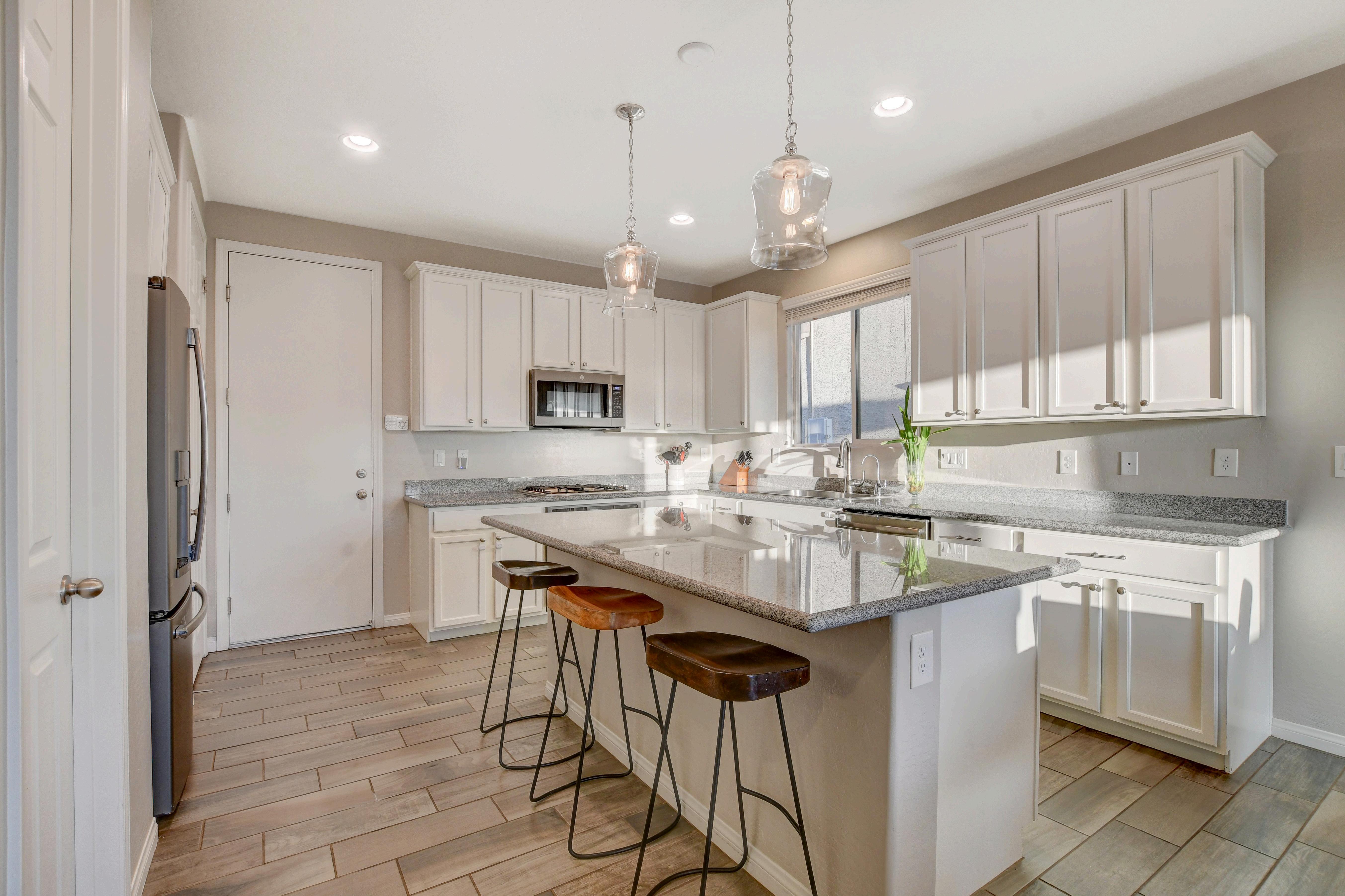 C H I C A N D S L E E K C U L I N A R Y S P A C E The kitchen boasts granite countertops and classic white cabinetry that provide a clean, sophisticated look, complemented by sleek stainless steel appliances. The plank tiling flooring extends throughout, tying the two areas together while enhancing the sense of continuity. Strategically placed pendant lighting above the kitchen island and a large round light fixture in the living area add a warm, inviting glow to the entire space.