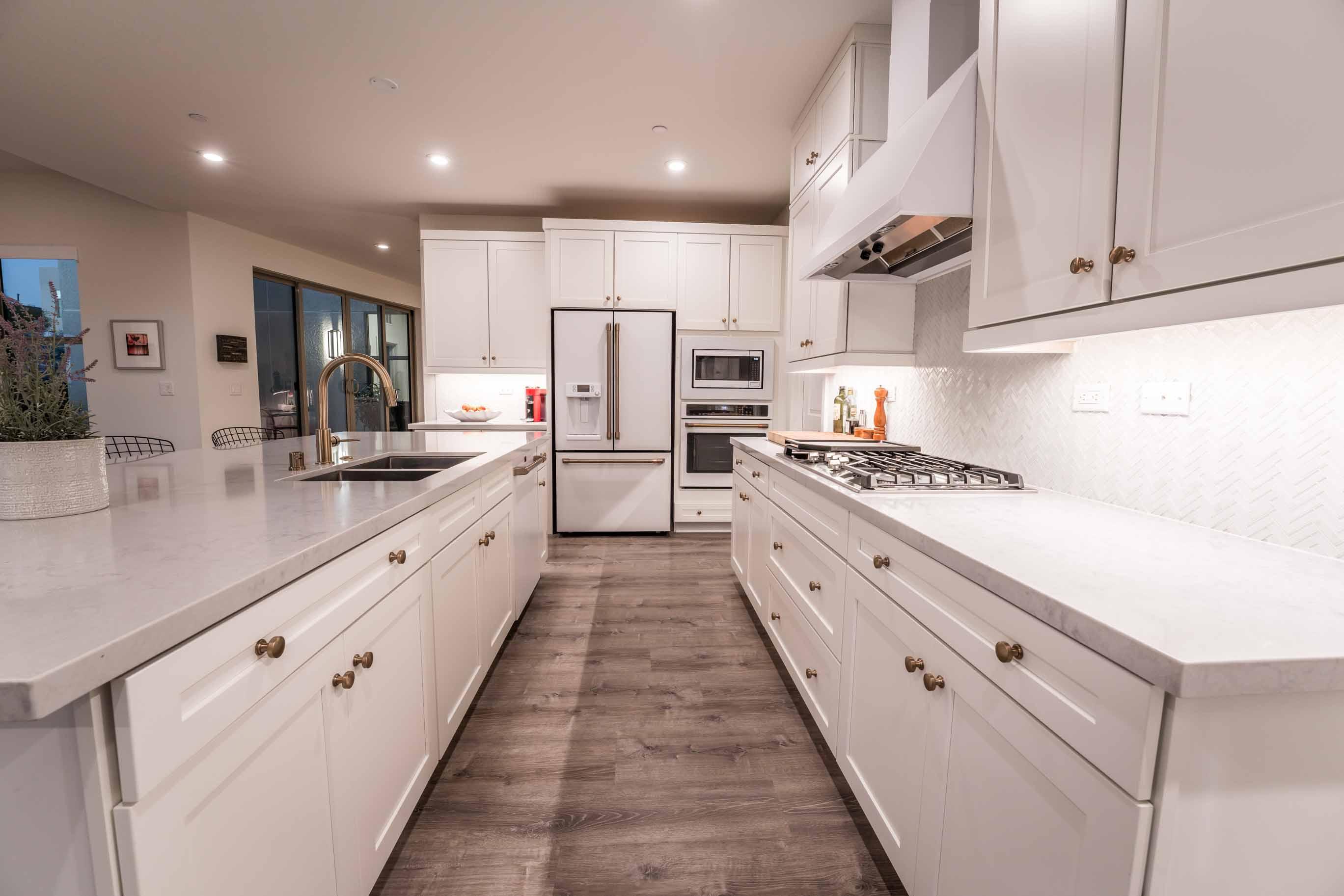 At its center, a substantial quartz island creates a stunning focal point, complemented by a suite of high-end "CAFE" appliances that cater to every culinary need. The spacious walk-in pantry promises abundant storage, ensuring every ingredient and tool is within reach.