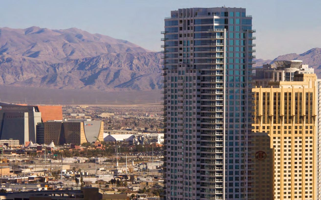Towering over the Las Vegas Strip like an aqua blue wave, Panorama Towers provides discriminating buyers a unique opportunity to live well in a more intimate environment. Panorama Towers offers a wealth of options in one and two-bedroom residences that range from 750 to 14,000 square feet and offer spectacular views of the Strip to the east and colorful beauty of Red Rock Canyon to the west. Panorama Towers is a world unto itself featuring his and hers spa facilities, a resort style pool with lounge areas, yoga and Pilates studio, indoor racquetball court and, best of all, 24-hour concierge service.