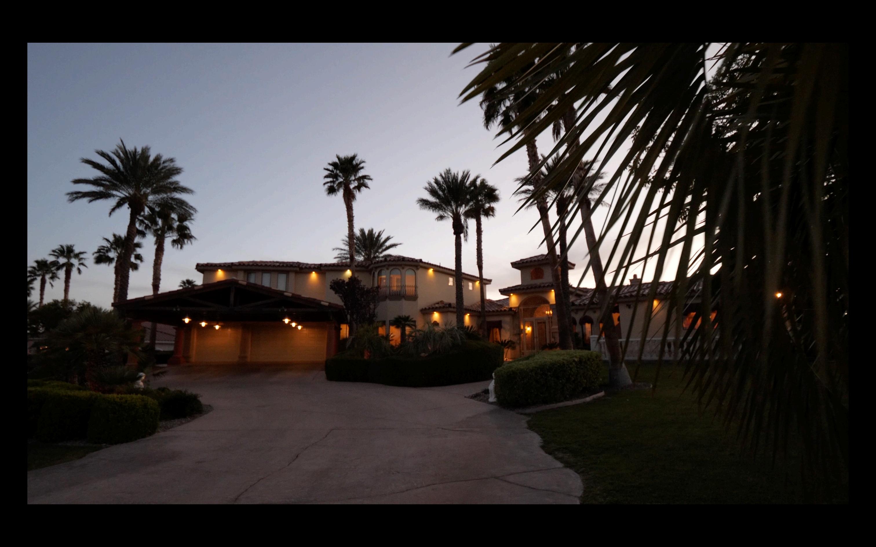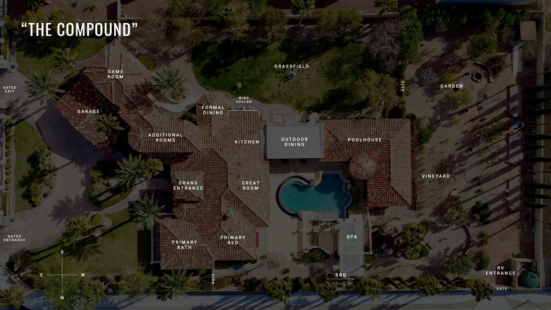 Welcome to the Tee Pee Compound, a luxury custom estate on a sprawling acre of land. This stunning property includes a beautifully appointed guest house featuring two bedrooms and a full kitchen, perfect for extended stays or additional privacy. The grand curb appeal is nothing short of breathtaking, with a gated circular driveway framed by meticulously manicured landscaping. Step through the impressive double iron glass doors and be greeted by soaring cathedral ceilings and intricate crown molding that grace the home throughout. The chef’s kitchen, equipped with premium stainless steel appliances, seamlessly connects to a formal dining room adorned with a show-stopping chandelier and a custom wine cellar. A curved iron staircase leads to the game room, offering captivating views of the Las Vegas Strip.