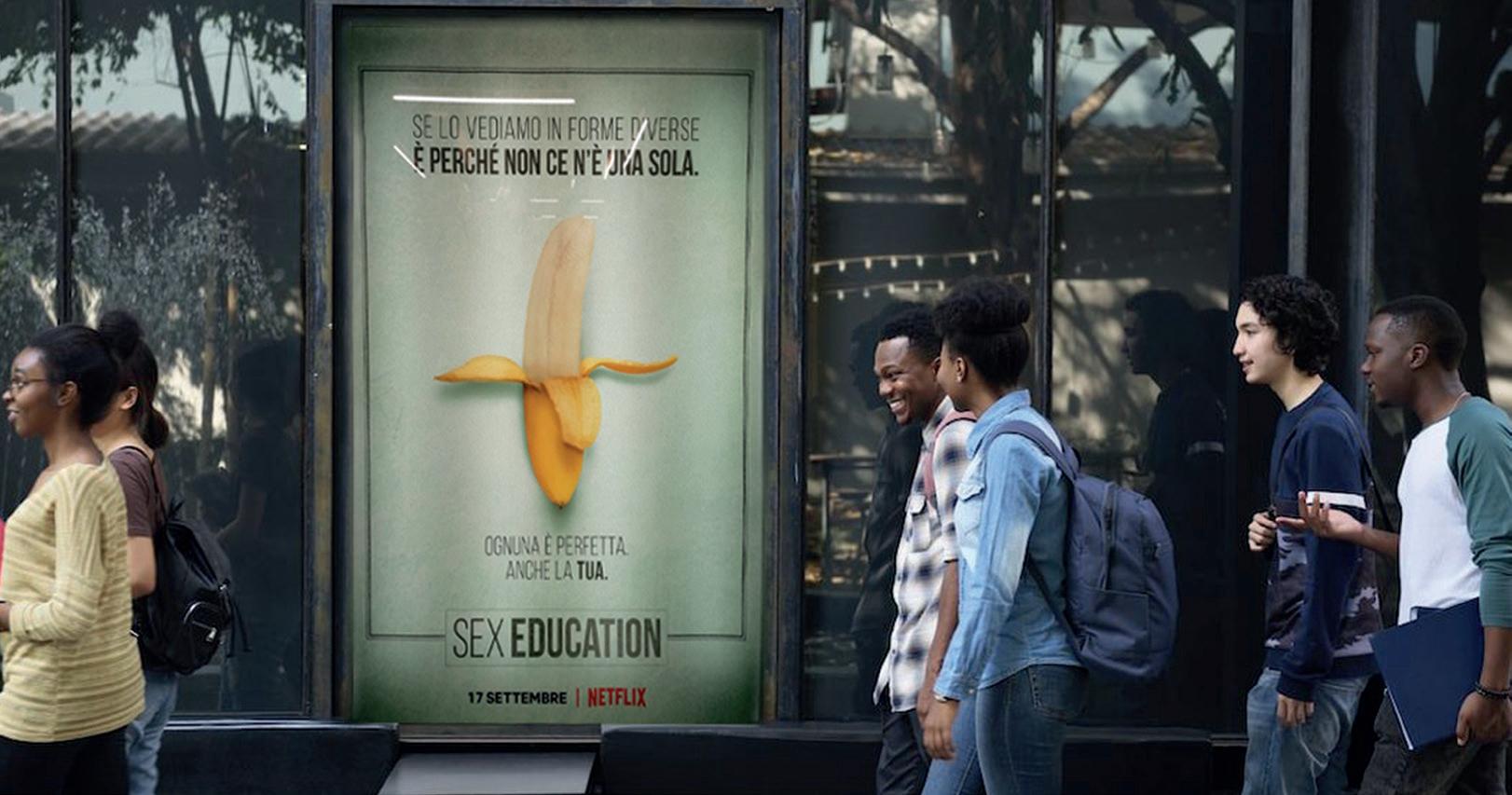 In foto la campagna pubblicitaria di Netflix per promuovere la terza stagione della serie televisiva Sex Education nel 2021. Fiori, frutti e altri elementi diventano immagini allusive di organi genitali.