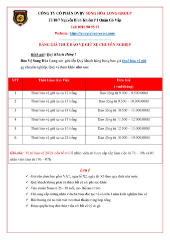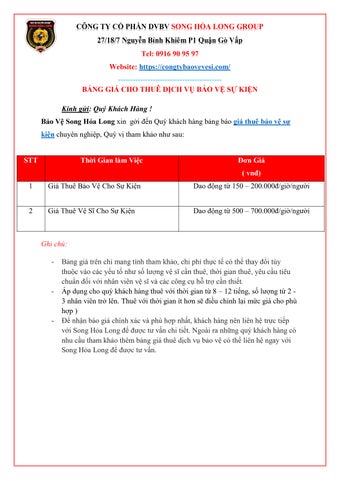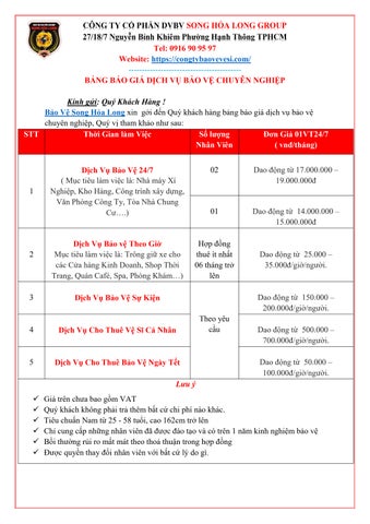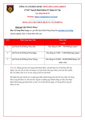 Bảo Vệ Song Hoả Long là Công Ty Bảo Vệ Chuyên Nghiệp, Uy Tín tại TPHCM. Công ty chuyên cung cấp, cho thuê “ dịch vụ bảo vệ & vệ sĩ chuyên nghiệp ” tại TPHCM, Bình Dương, Đồng Nai, Long An…24/7. theo giờ Chuyên Nghiệp, Giá Tốt Thông tin liên hệ CÔNG TY CỔ PHẦN DỊCH VỤ BẢO VỆ SONG HỎA LONG GROUP Trụ sở chính: 27/18/7 Nguyễn Bỉnh Khiêm, Phường 1, Quận Gò Vấp, Thành Phố Hồ Chí Minh, Việt Nam Hotline: 0916 90 95 97 Email: baovesonghoalonggroup@gmail.com Website: https://congtybaovevesi.com/ #baovesonghoalong #baovechuyennghiep #congtybaovechuyennghiep