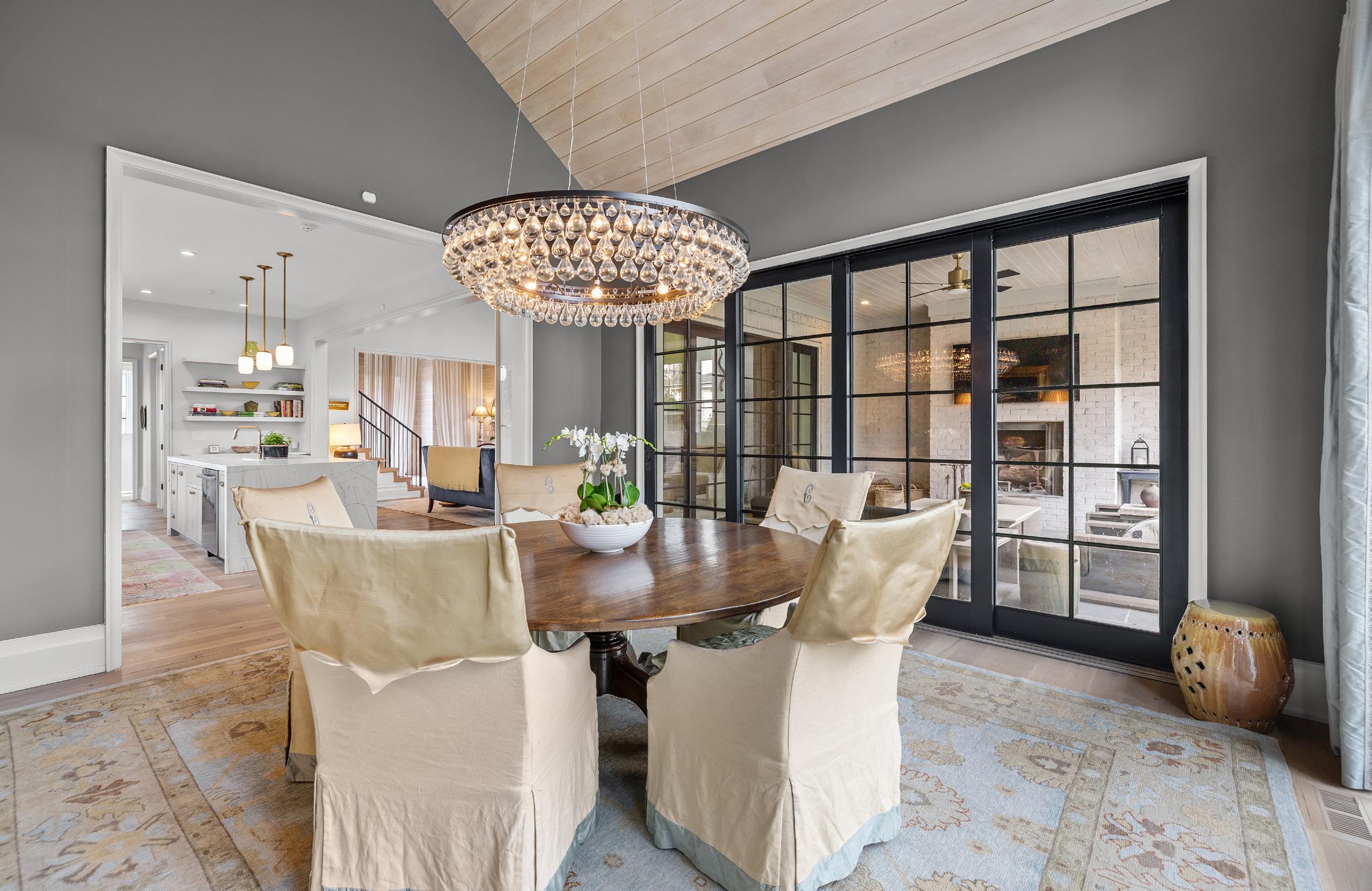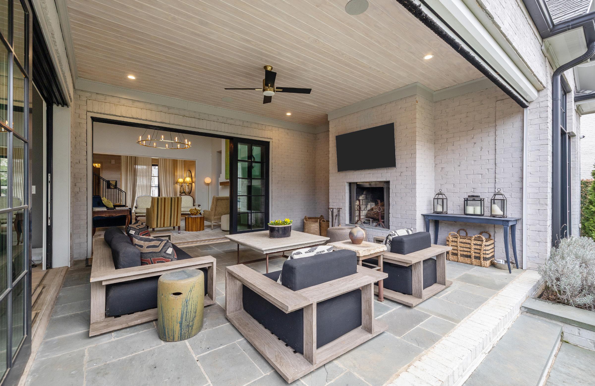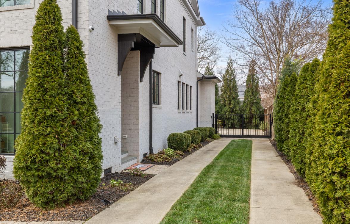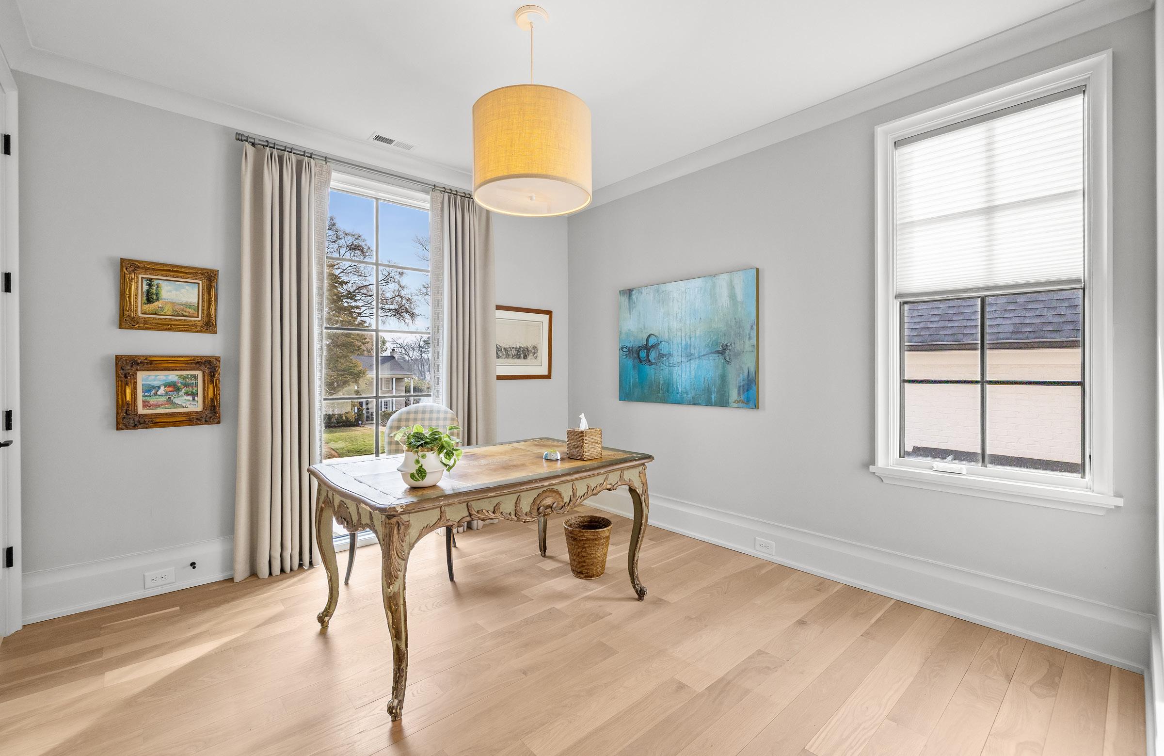 An EXQUISITE EASTOVER custom built residence blending timeless architecture with modern luxury. Curb appeal features tumbled brick, metal windows, bluestone accents, curated landscaping, and a dramatic steel-and-glass pivot entry door. Inside, light-filled interiors showcase white oak hardwood floors, custom trim, whitewashed shiplap, exposed beams, and soaring ceilings. The Great Room boasts 15’ ceilings, transom windows, a custom fireplace with reclaimed white oak mantel, and a concealed Hall library with built-in shelving. Sliding glass walls in the Great and Dining Rooms open to a covered terrace with bluestone flooring, ceiling fan, and masonry fireplace, ideal for indoor-outdoor entertaining. The open chef’s kitchen features a gray-washed white oak waterfall island with Lavezzi leathered quartzite countertops, Silestone perimeter counters, marble backsplash, and custom cabinetry. Premium appliances include Sub-Zero refrigeration, integrated dual-zone wine tower, Wolf 48” dual-fuel range, and ASKO dishwasher, plus a dedicated beverage, prep and pantry area. The main-level primary suite offers vaulted ceilings, French doors to the landscaped yard, access to a private retreat, and a spa-inspired bath with freestanding tub, frameless glass shower, marble countertops, and walk-in closets. Upper levels provide four bedrooms with two ensuite, full laundry, den/media space, study/office, and a generous third-floor bonus room for exercise or a private study with walk-in attic storage. The upstairs left suite would function seamlessly as a secondary primary retreat. Additional highlights include two laundry rooms, energy-efficient construction, and a detached two-car garage. Convenient to shops and restaurants in the Myers Park and Eastover area with an easy commute to Uptown.