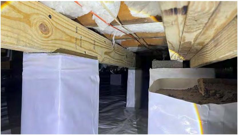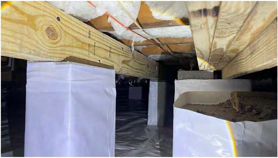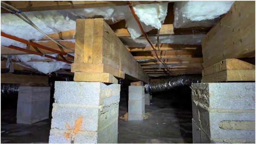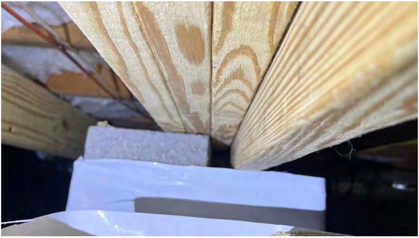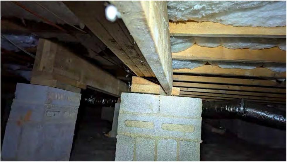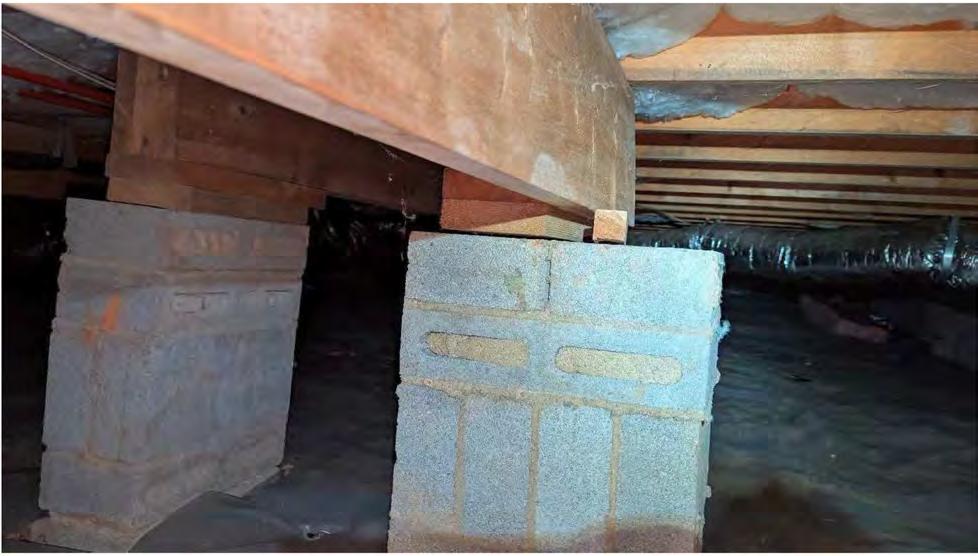 3.5.3. Site visit08/21/25: Itwas observed that the repairedwork performed, includewhat it appears to be the addition of an extra CMU blockat the pier and the installation of three 2x10members forming a girder centered on the pier. The corrective work performed provides adequate bearing and alignment. No further corrective action is recommended at this time for this item.