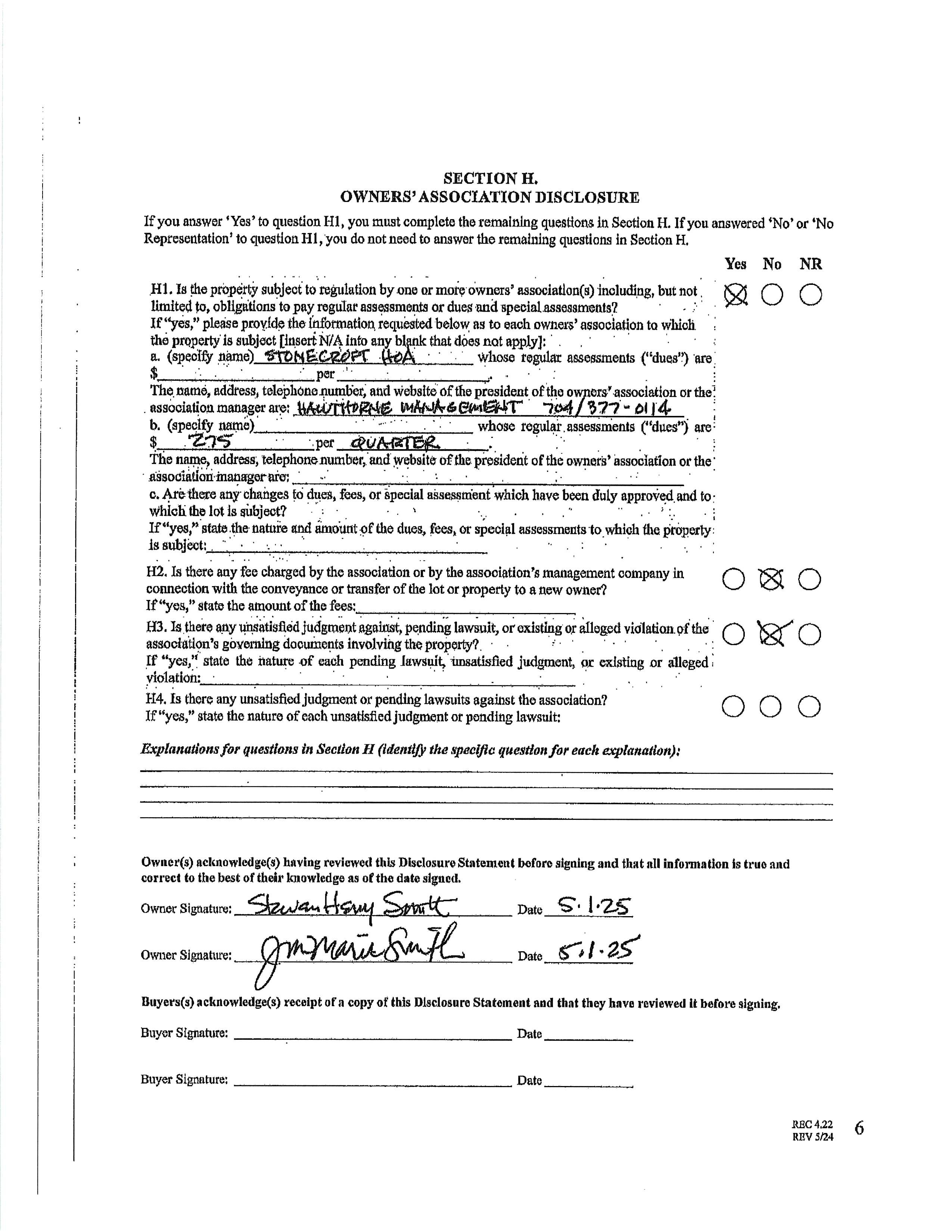 HOA Subj Dues: HOA Mangemnt: Hawthorne Management HOA Phone: 7043770114 Assoc Fee: $275/Quarterly