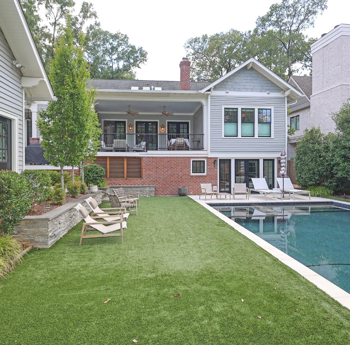 • Large covered rear porch for seating and dining, with a gas firepit overlooking the private yard, resort pool, and a glimpse of uptown