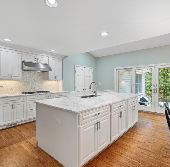 • Kitchen recently renovated in 2015 featuring a large center island, marble counters, under cabinet lighting, Bosch appliances, warming drawer, pantry, and dry bar/coffee bar area
